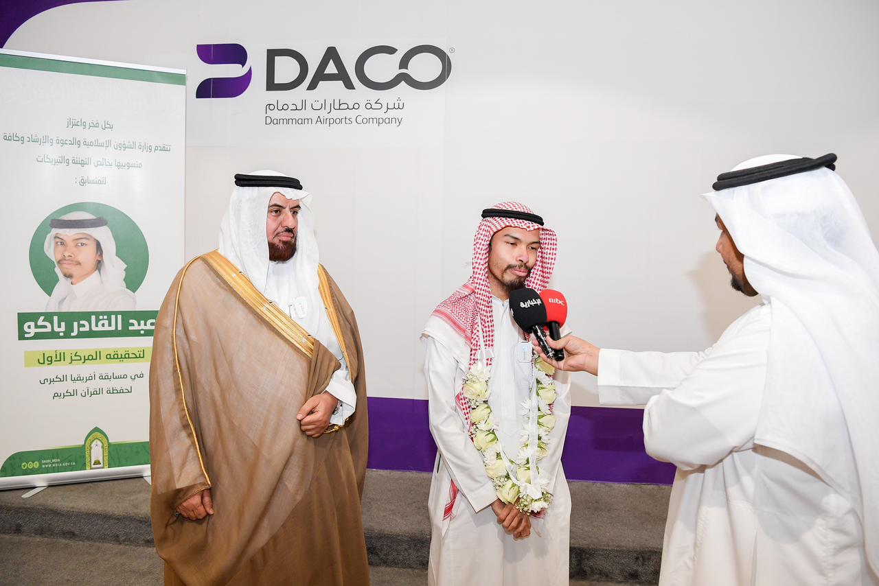 وبهذه المناسبة المشرفة وإنفاذاً لتوجيهات معالي وزير الشؤون الإسلامية والدعوة والإرشاد الشيخ الدكتور عبداللطيف بن عبدالعزيز آل الشيخ أقامت الوزارة مراسم رسمية لاستقبال ممثل المملكة في هذه المسابقة الكبرى لحفظ القرآن الكريم لدى وصوله لمطار الملك فهد الدولي بمدينة الدمام ظهر اليوم الثلاثاء العشرين من شهر رمضان المبارك بحضور المدير العام لفرع الوزارة بالمنطقة الشرقية الشيخ عمر بن فيصل الدويش والمتحدث الرسمي للوزارة الأستاذ عبدالله بن يتيم العنزي وممثل الأمانة العامة للمسابقة المحلية والدولية بالوزارة الأستاذ سامي المطيري والمدير التنفيذي لجمعية تحفيظ القرآن الكريم بالمنطقة الشرقية الشيخ خليفة سعد الدخيل وعدد من المسؤولين بالفرع ومندوبي المراسم بمطار الملك فهد الدولي بالدمام .