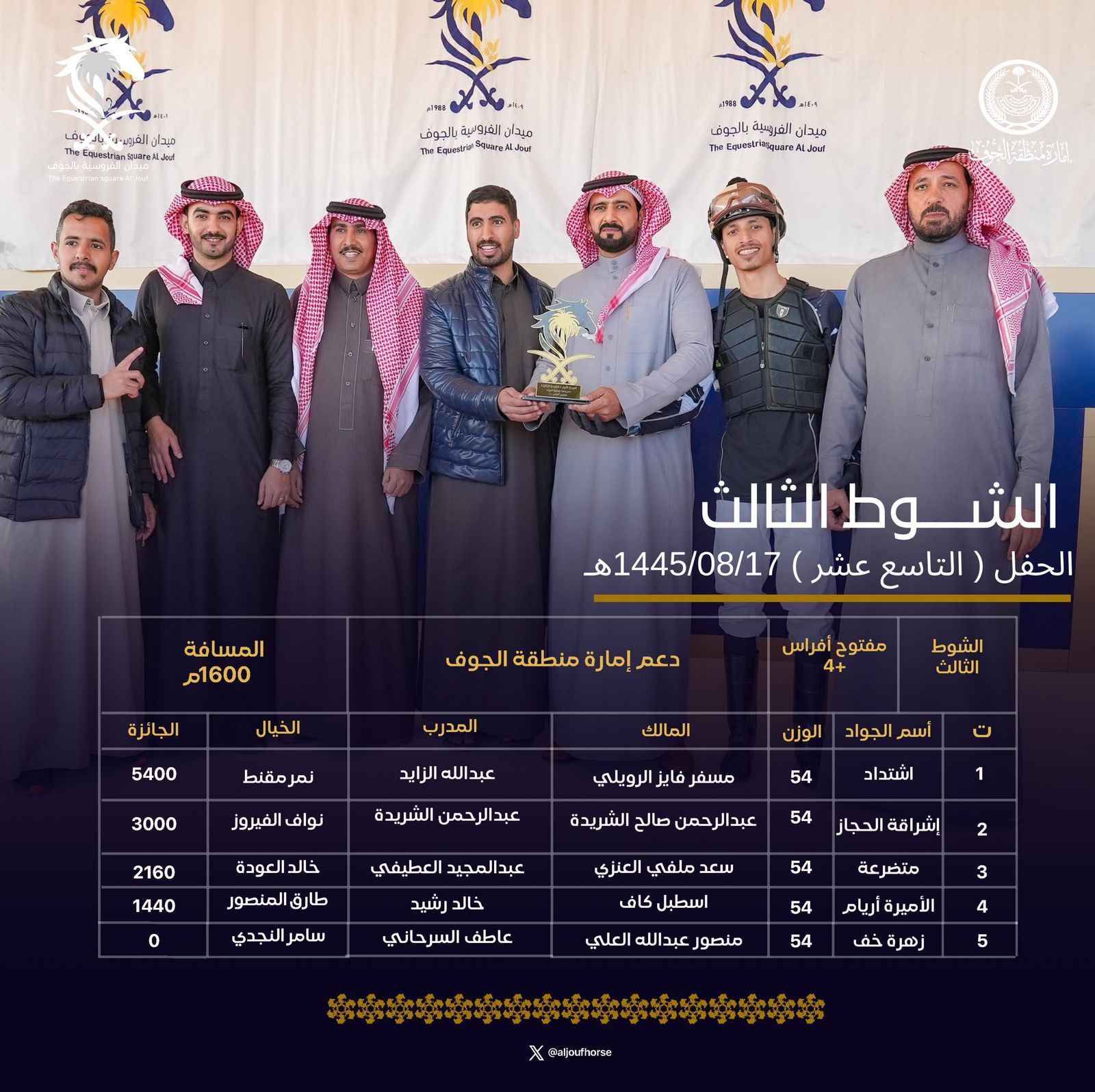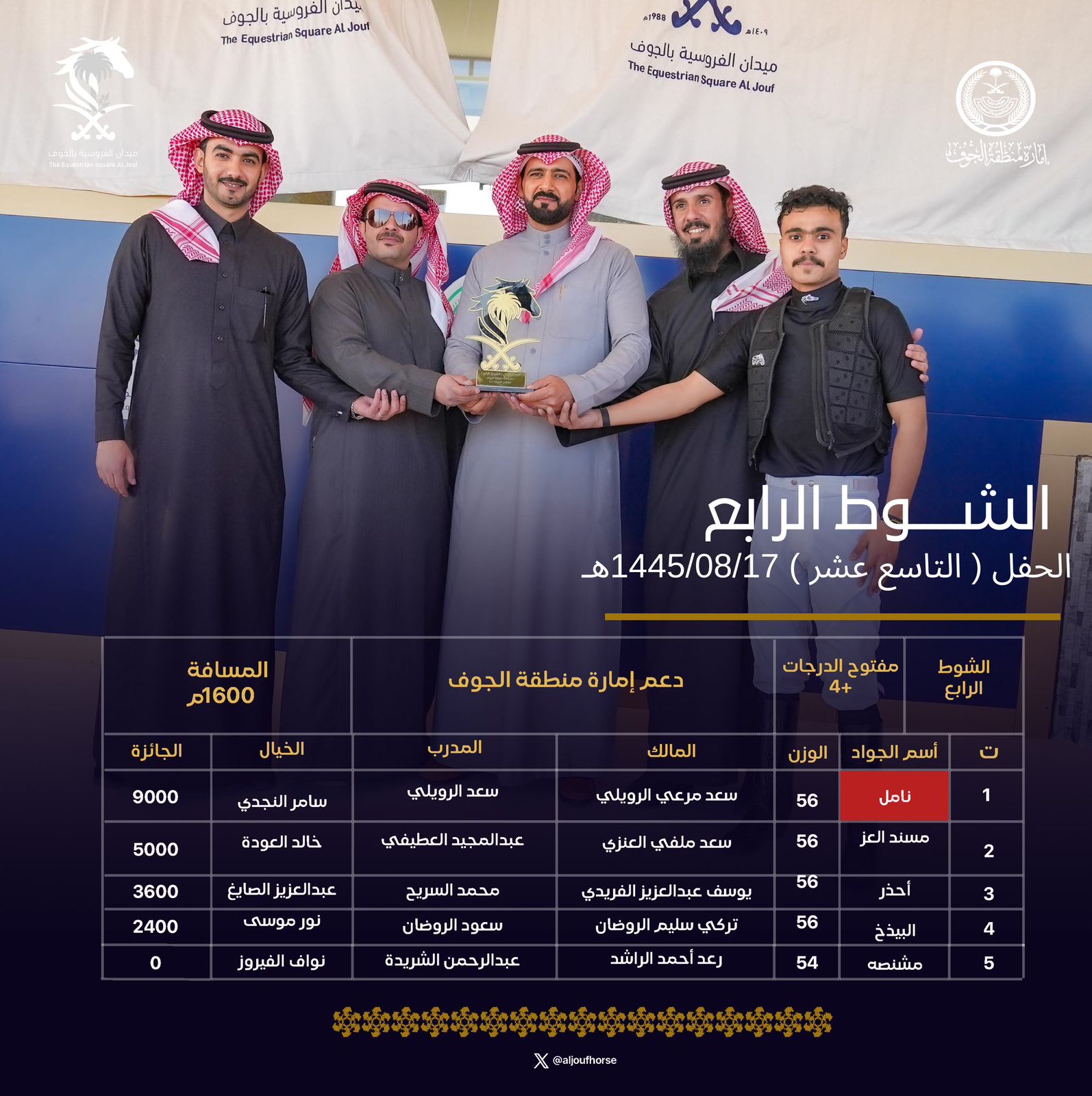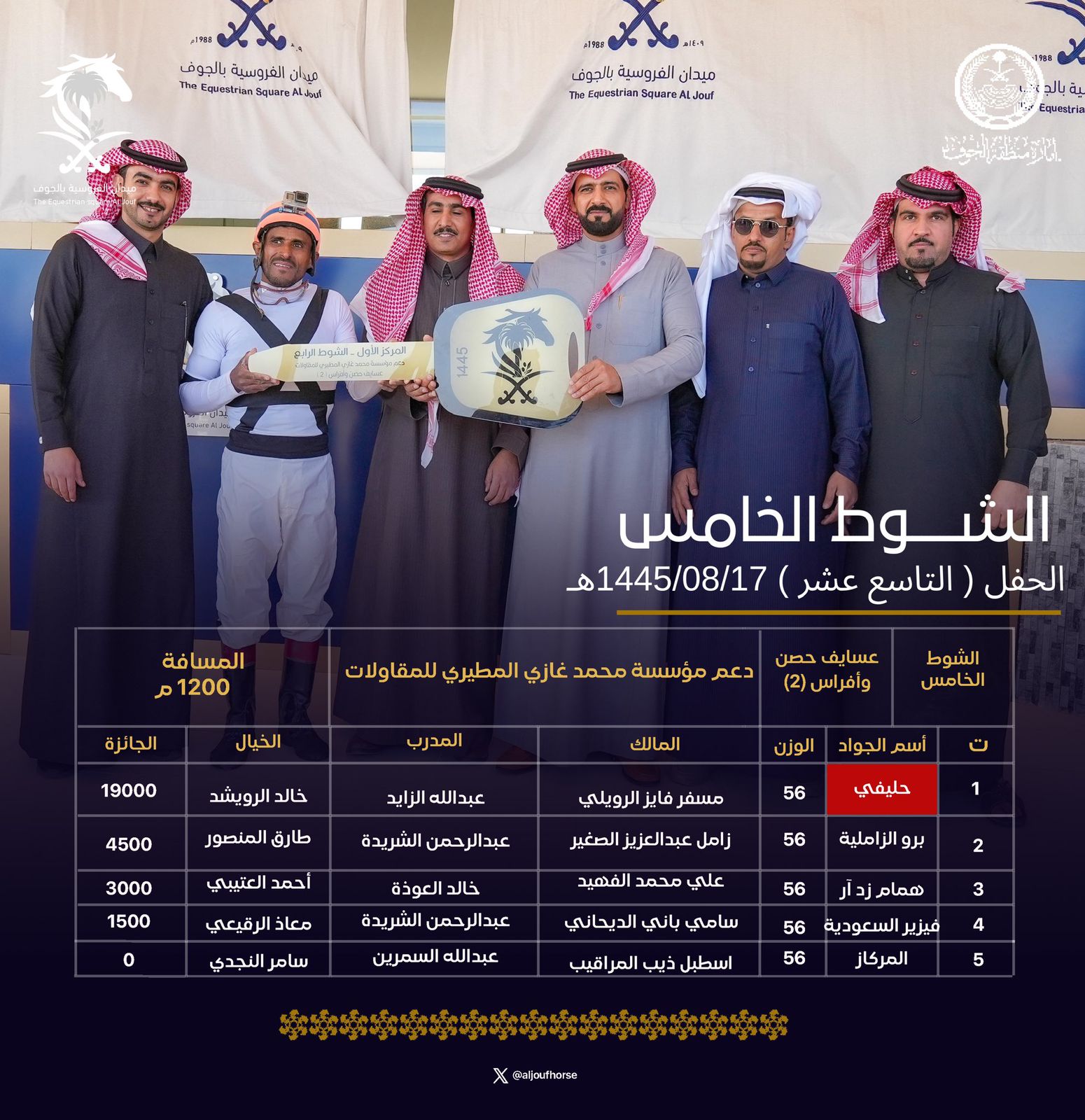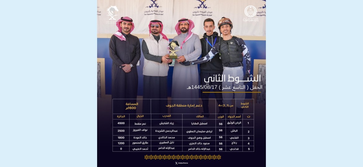 تصاعدت وتيرة التنافس بين الملاك والخيالة المشاركين في منافسات موسم هذا العام 1445 هـ في ميدان الفروسية بالجوف مع بلوغ المنافسات محطة حفل السباقات الـ19 ، الذي تضمن 5 أشواط منها 4 بدعم من إمارة منطقة الجوف وشوط بدعم من مؤسسة محمد غازي المطيري للمقاولات.