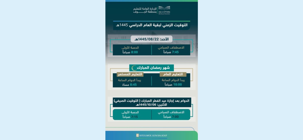 كما أعلنت إدارة تعليم الجوف عن أوقات الدوام بعد إجازة عيد الفطر المبارك، يث يبداء الاصطفاف الصباحي عند الساعة 7:00صباحاً ،وتبداء الحصة الأولى 7:15 صباحاً.