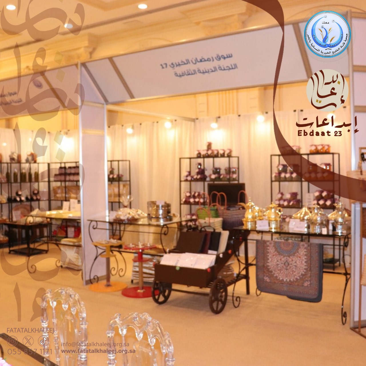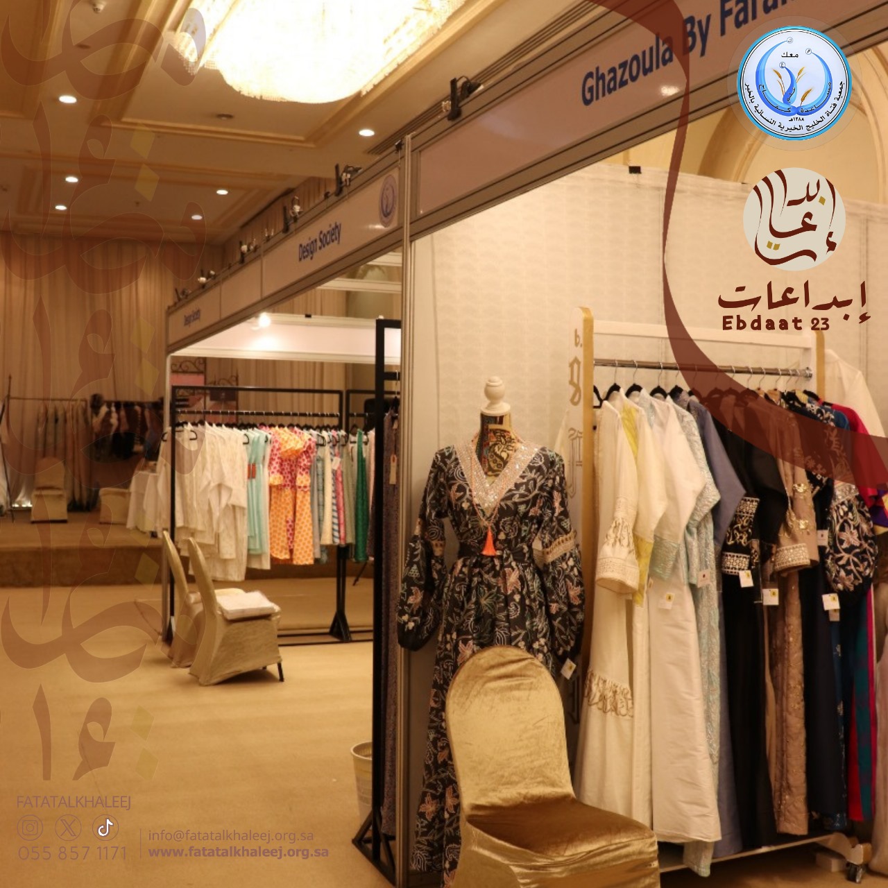 ومعرض جمعية فتاة الخليج الخيرية النسائية للجلابيات السنوي ( ابداعات ٢٣ ) والذي يعتبر دعم لبرامج الجمعية الخيريه وملتقى لإبداعات المرأة السعودية تحت سقف واحد وبعروض متميزه أقيم المعرض في قاعة سماح بفندق القصيبي بالخبر أيام الاثنين الثلاثاء الأربعاء ١٩ ، ٢٠ ، ٢١ فبراير ٢٠٢٤ تحت رعاية وبحضور صاحبة السمو الأميرة عبير بنت فيصل بن تركي ال سعود حرم صاحب السمو الملكي أمير المنطقة الشرقيه حيث تم الافتتاح يوم الاثنين ١٩ فبراير ٢٠٢٤