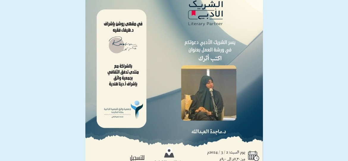 تقدم الدكتورة ماجدة العبدالله بالتعاون مع الشريك الأدبي، ورشة عمل بعنوان "اكتب التراث"، وذلك في مقهى "روشن"تحت إشراف الدكتورة هيفاء فقيه، والشراكة مع منتدى تدفق الثقافي بجمعية واثق وبإشراف الأستاذة دينا هندية.