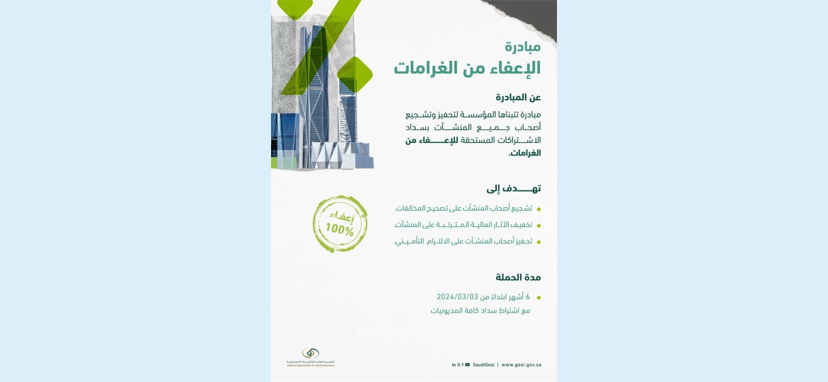 أطلقت المؤسسة العامة للتأمينات الاجتماعية مبادرة الإعفاء من غرامات التأخير وغرامات المخالفات الموجهة لأصحاب العمل والمنشآت، وذلك ضمن جهود المؤسسة لتصحيح واقع المنشآت المخالفة، وتسوية المديونيات وتخفيف الآثار المالية إضافة إلى تعزيز مبدأ الالتزام التأميني الذي من شأنه ضمان الحفاظ على حقوق المشترك وصاحب العمل.