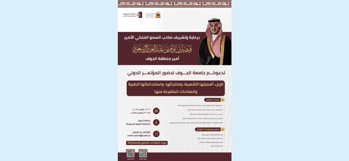 برعاية صاحب السمو الملكي الأمير فيصل بن نواف بن عبدالعزيز أمير منطقة الجوف، تقيم جامعة الجوف بالشراكة مع إمارة المنطقة يوم الأربعاء القادم المؤتمر الدولي "الإبل، أهميتها الشعبية، ومنتجاتها، واستخداماتها الطبية، والصناعات المتفرعة عنها" والذي يستمر لمدة يومين.