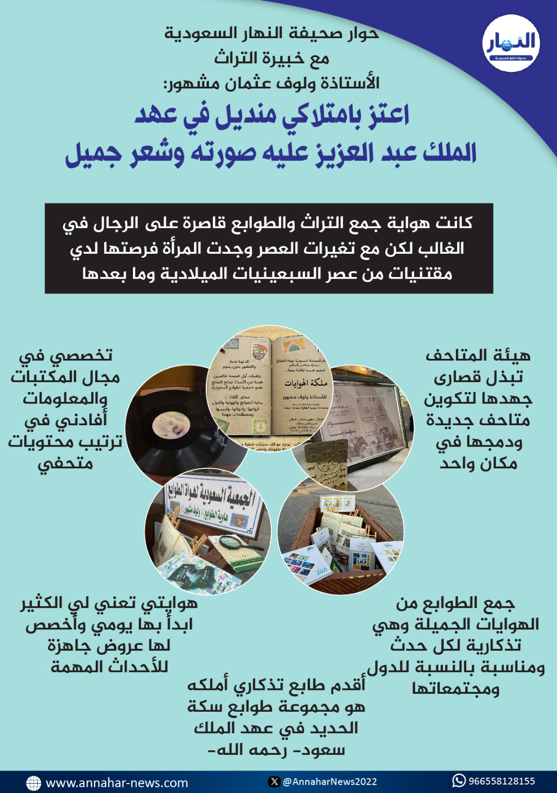الأستاذة  ولوف عثمان  مشهور من مدينة جده وهي من الأسر المكية التي نزحت من مكة المكرمة ومن حي المسفلة التاريخي العريق هذا الحي الذي شكل عنصرمهم في ثقافتنا وساهم في الحركة الأدبية بمكه منذ عصر الرواد حينها إستقرت مع أسرتها وهي صغيرة بهذه المدينة الساحرة والتي تأخذ الألباب وربما مناخ هذه المدينة الثقافي كان مساعد لها وهي من السيدات اللاتي اهتممن بالتراث منذ زمن طويل لدرجة العشق إضافة لكونها من هواة  جمع الطوابع  فواءمة بين هاتين الهوايتين ضمن تراث هذا الوطن الغالي ومن ضمنه تراث الحجاز و من حرصها لحفظ مقتنياتها القديمة قامت بإنشاء متحف وخصصت له جناح بشقتها السكنية من أجل أن يكون بالقرب منها لتوليه إهتمامها وكان والدها رحمة الله عليه من الرجال المتعلمين والمتنورين ومن الذين احبو التراث وإهتم به وأورث هذا الحب لإبنته حين كانت يافعة والأستاذة ولوف عززت هذا الإهتمام بالتراث كونها تربوية من منسوبي التعليم معلمة لمادة "مكتبات ومعلومات" فجعلت من متحفها ملفت للأنظار بطريقتها في عرض المقتنيات فتجدها مرتبة ومنظمة وجذابة وهي لا تمانع من فتحه للزوار وذلك بالتنسيق معها مسبقاً وهي دائماً ما تحتفل بأيام الوطن المجيدة ومنها يوم التأسيس والذي اعدت له إحتفالية بموقعها بمنطقة جدة التاريخية وبهذه المناسبة السعيدة علينا كسعوديين يسرنا بصحيفة النهار السعودية أن تكون الأستاذة ولوف مشهور ضيفتنا من خلال هذا الحوار الشيق معها والذي طرحنا فيه اسئلة عن هذه الهوايات التي عشقتها والتي أخذت منها جهدها ووقتها كذلك من مالها فأهلاً وسهلاً بكم