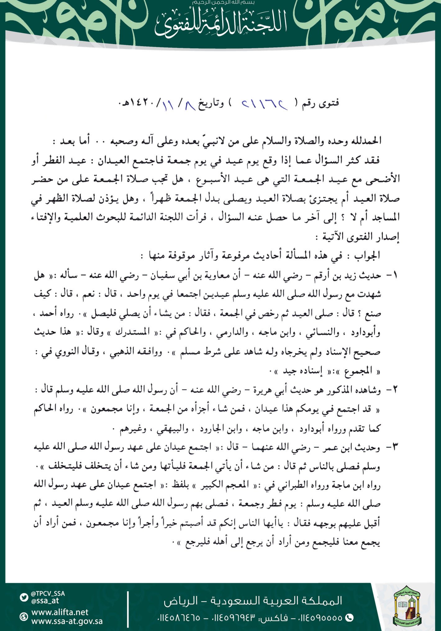 أوضحت وزارة الشؤون الإسلامية والدعوة والإرشاد أن عيد الفطر المبارك لهذا العام 1444هـ قد يوافق يوم الجمعة، ولأهمية بيان ما يتعلق بإقامة صلاة الجمعة في #يوم_العيد، فقد وجهت وزارة #الشؤون_الإسلامية والدعوة والإرشاد أئمة المساجد والجوامع باعتماد العمل بما تضمنته الفتوى الصادرة عن اللجنة الدائمة للفتوى رقم (21162) في 8 / 11 / 1420هـ حول حكم صلاة الجمعة إذا اجتمع يوم العيد ويوم الجمعة في يوم واحد، والمتضمنة التالي:
