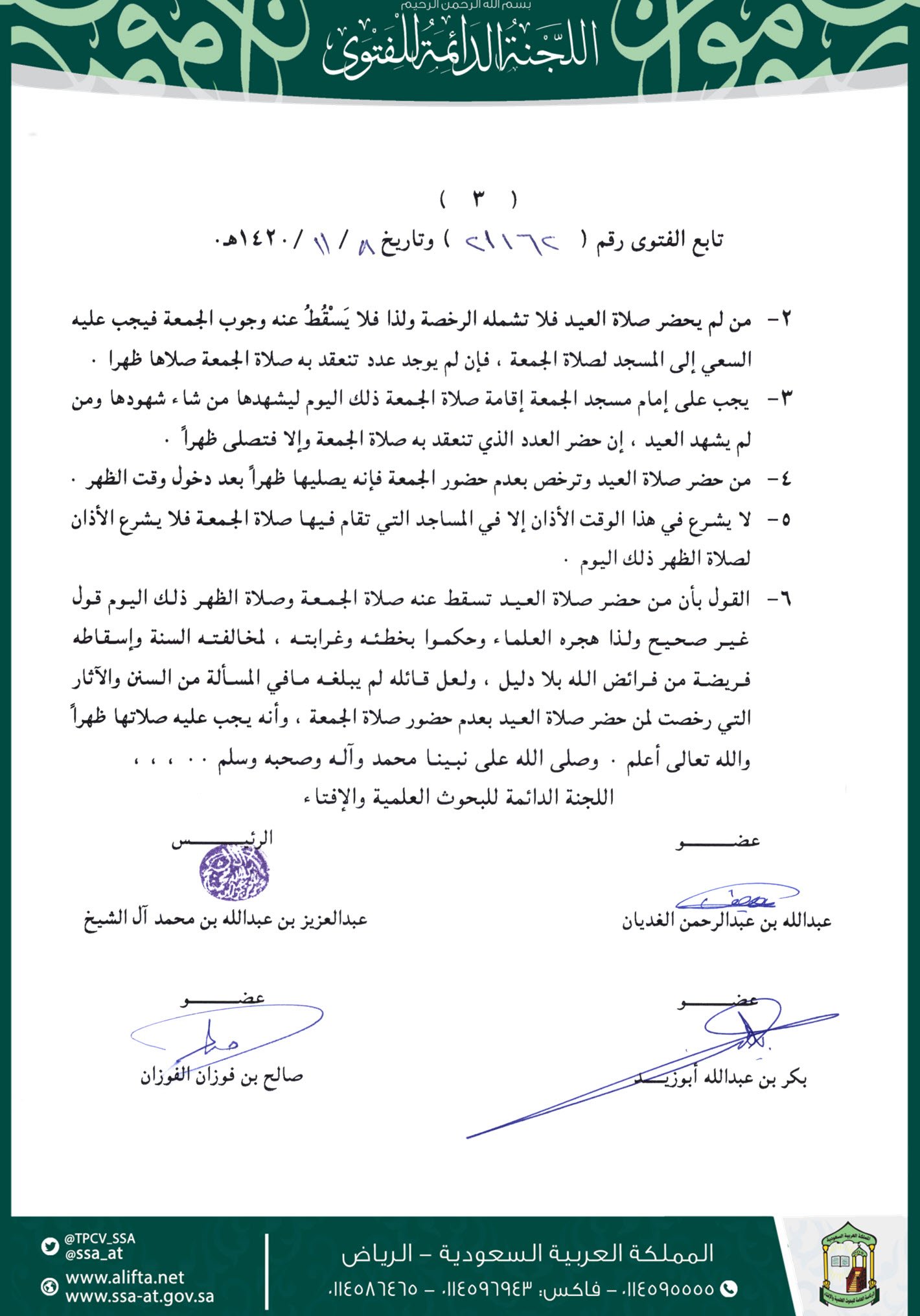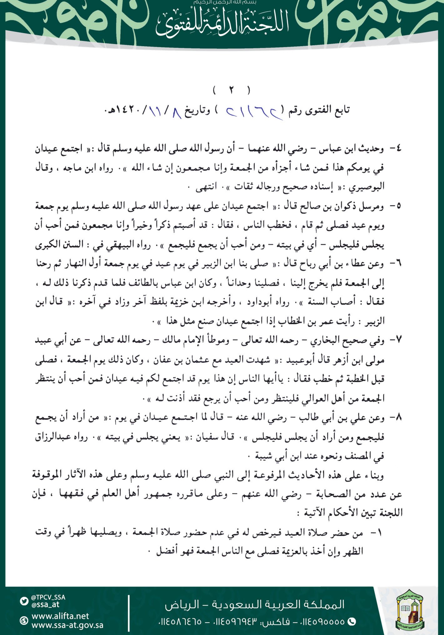 3- يجب على إمام مسجد الجمعة إقامة صلاة الجمعة ذلك اليوم ليشهدها من شاء شهودها ومن لم يشهد العيد ، إن حضر العدد التي تنعقد به صلاة الجمعة وإلاّ فتصلى ظهراً.