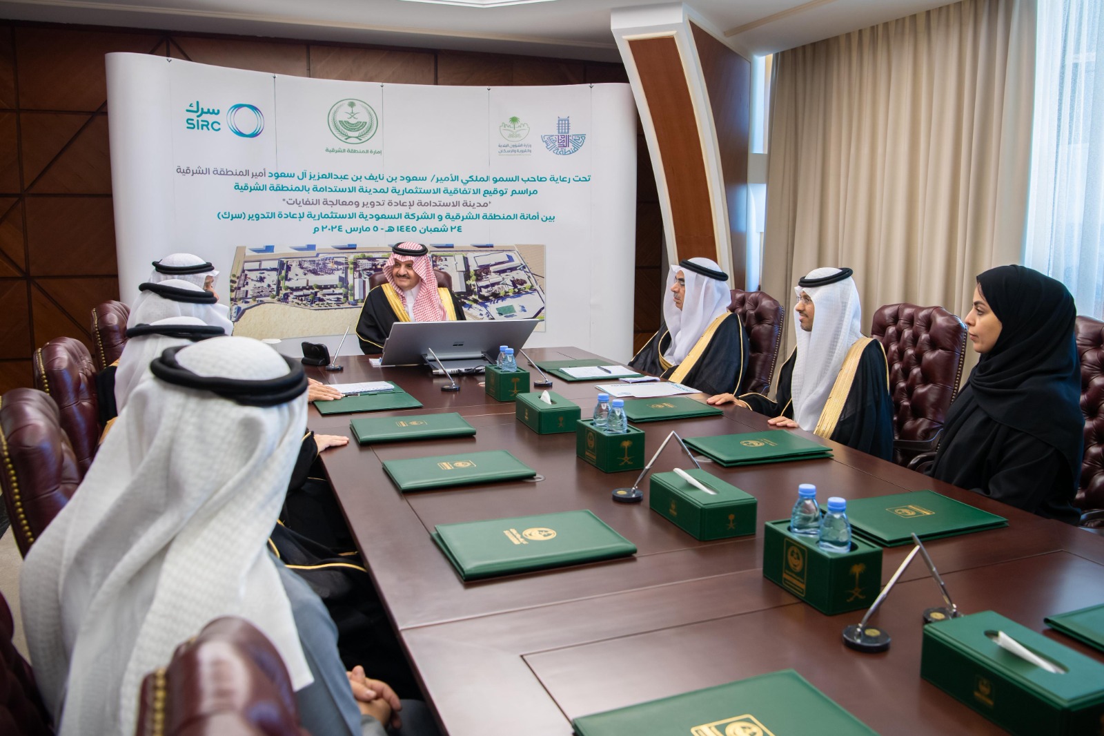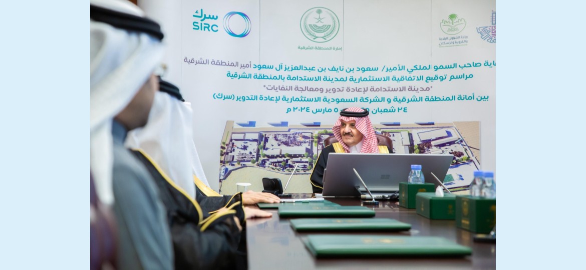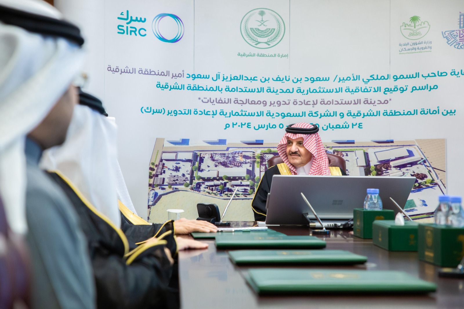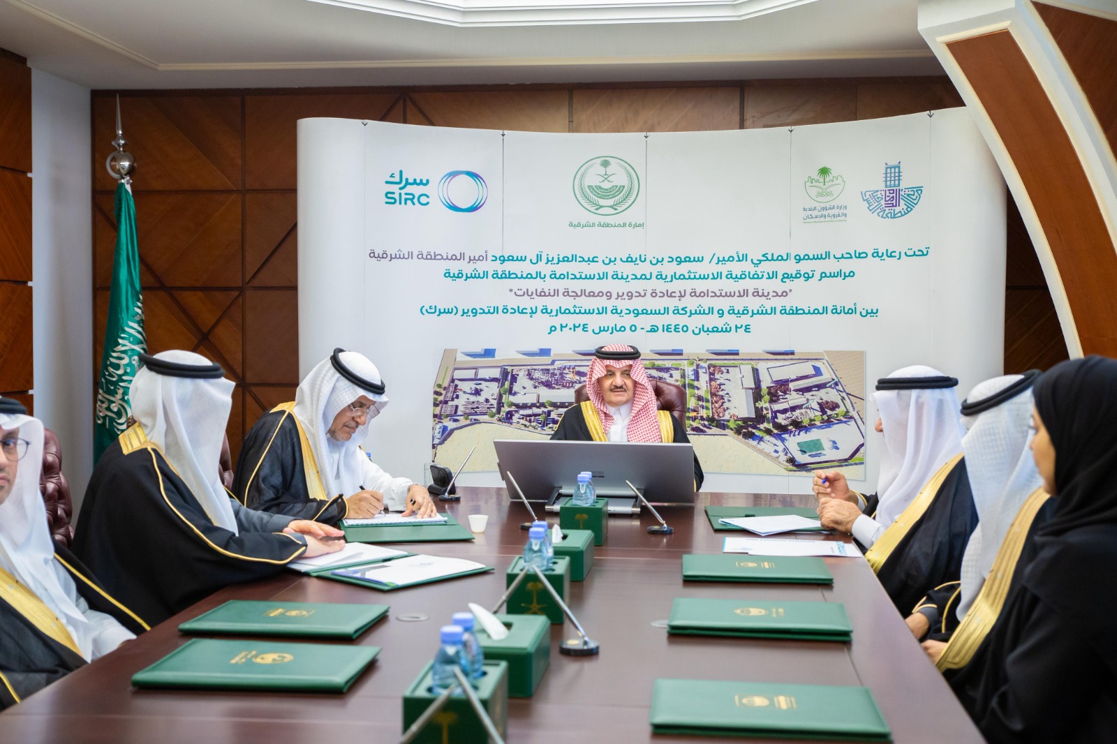 رعى صاحب السمو الملكي الأمير سعود بن نايف بن عبدالعزيز أمير المنطقة الشرقية ، في مكتب سموه بديوان الإمارة اليوم الاربعاء ، توقيع الاتفاقية الاستثمارية لمدينة الاستدامة لتدوير ومعالجة النفايات بين الشركة السعودية الاستثمارية لاعادة التدوير (سرك) التابعة لصندوق الاستثمارات العامة وأمانة المنطقة الشرقية .