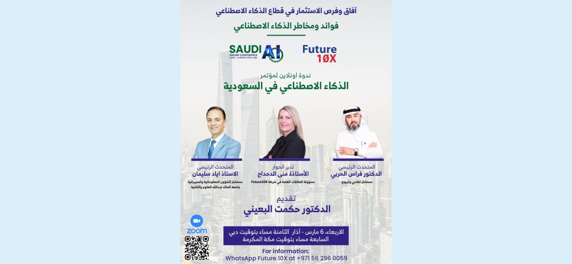 تعقد مساء اليوم ندوة بعنوان "آفاق وفرص الاستثمار في قطاع الذكاء الاصطناعي .. فوائد ومخاطر الذكاء الاصطناعي"، وذلك في تمام الساعة السابعة مساءً بتوقيت مكة المكرمة والثامنة مساءً بتوقيت دبي.