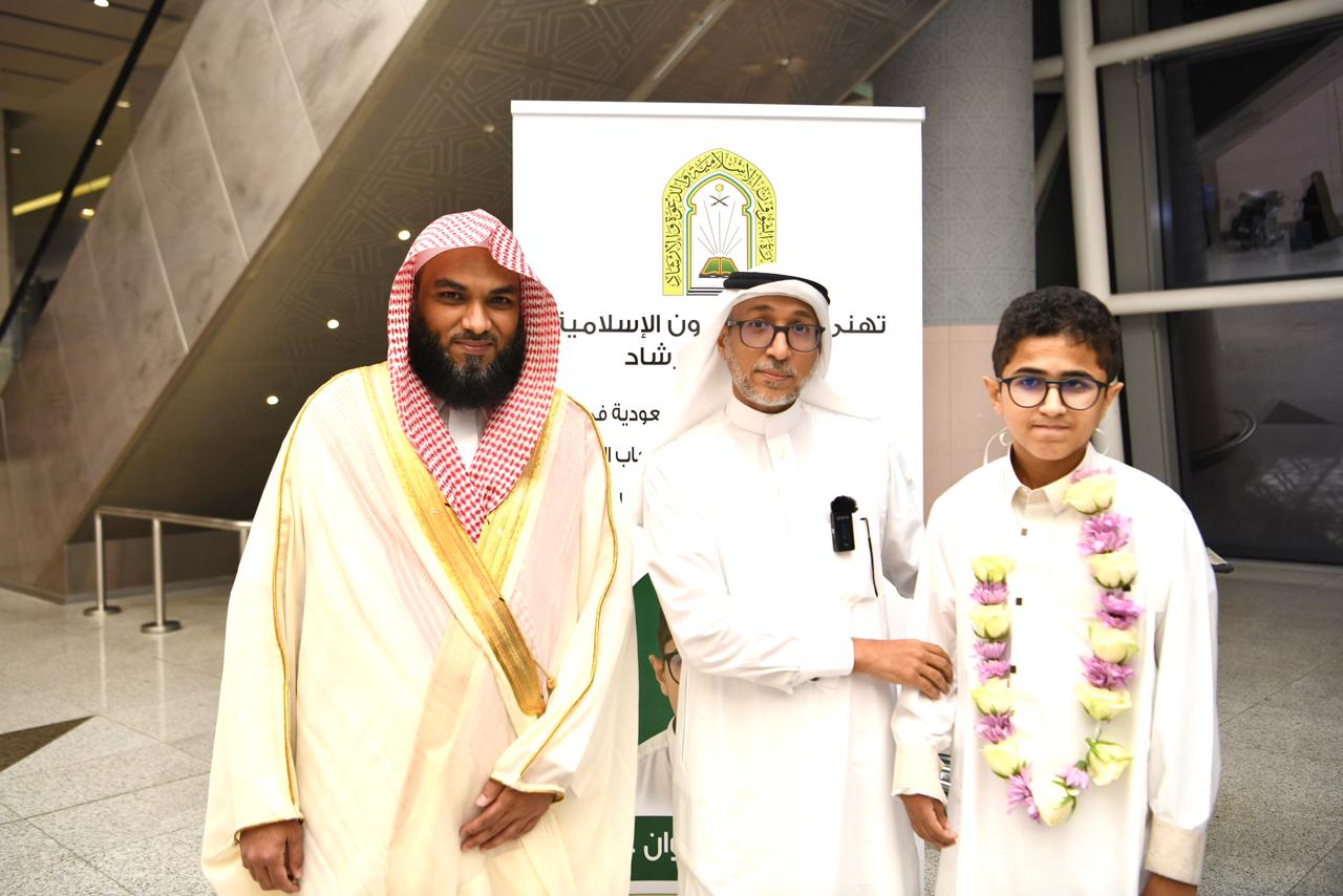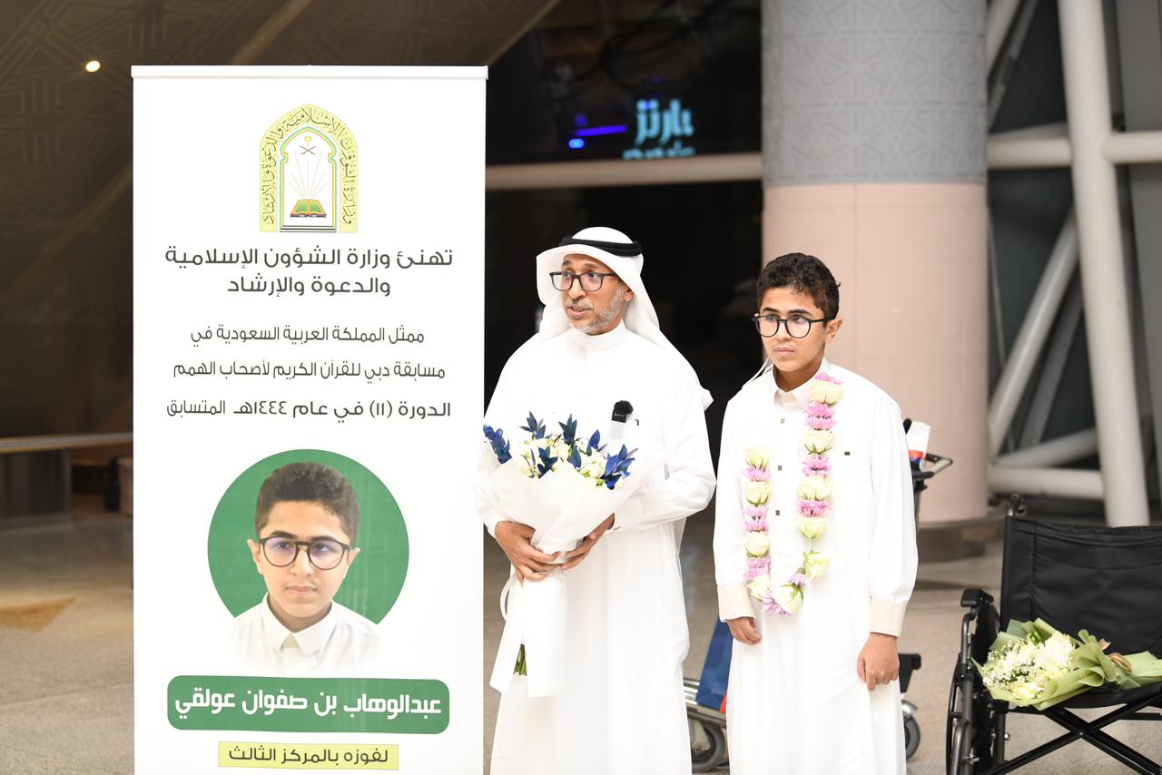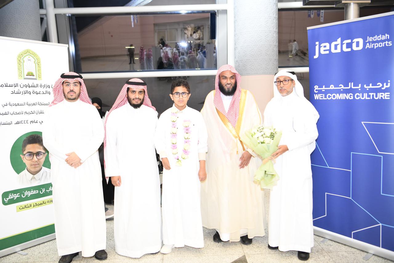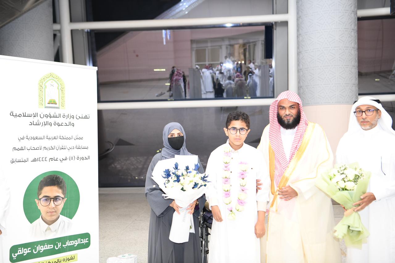 وبهذه المناسبة المباركة وتنفيذاً لتوجيهات معالي وزير الشؤون الإسلامية والدعوة والإرشاد الشيخ الدكتور عبداللطيف بن عبدالعزيز آل الشيخ أقامت الوزارة مراسم رسمية لإستقبال ممثل المملكة في هذه المسابقة لحفظ القرآن الكريم ، ووالديه لدى وصولهم مطار الملك عبدالعزيز الدولي بمدينة جدة اليوم الجمعة الثالث و العشرون من شهر رمضان المبارك ، وبحضور فضيلة المدير العام لفرع الوزارة بمنطقة مكة المكرمة الدكتور سالم بن حاج الخامري ، وعدداً من المسؤولين بمطار الملك عبدالعزيز الدولي بمدينة جدة .