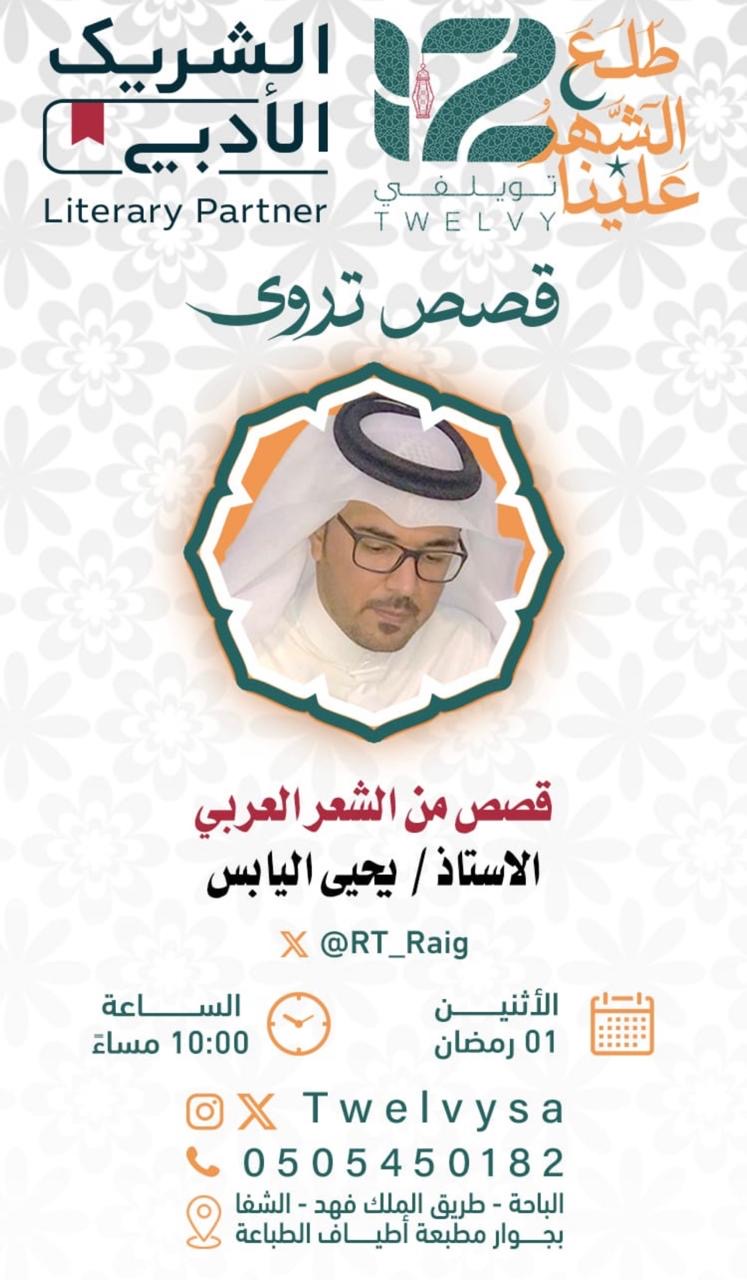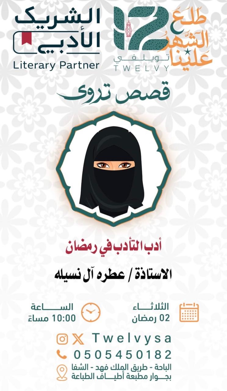 يستضيف مقهى تويلفي الثقافي بالتعاون مع الشريك الأدبي أمسيات ثقافية تحت عنوان "قصص تروى"، والتي تُقام في أول ثلاث أيام من شهر رمضان الكريم.