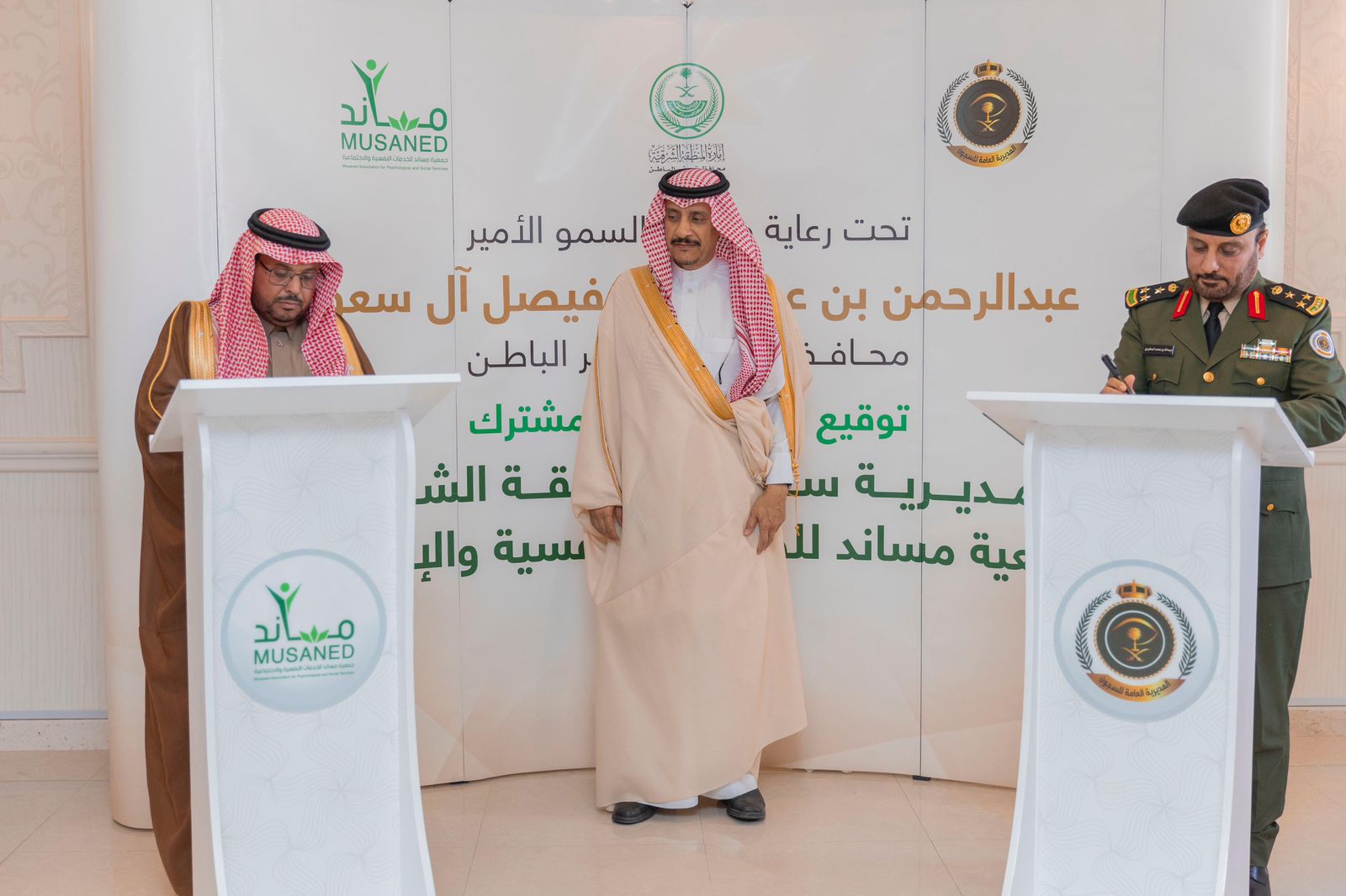 برعاية صاحب السمو الأمير عبد الرحمن بن عبد الله بن فيصل محافظ حفر الباطن، وقعت بمقر المحافظة اليوم الاحد، اتفاقية (كي لا نعود) بين مديرية السجون بالمنطقة الشرقية وجمعية مساند للخدمات النفسية والاجتماعية بحفر الباطن لتقديم الخدمات النفسية والاجتماعية بكادر متخصص في المجال النفسي والخدمة الاجتماعية
