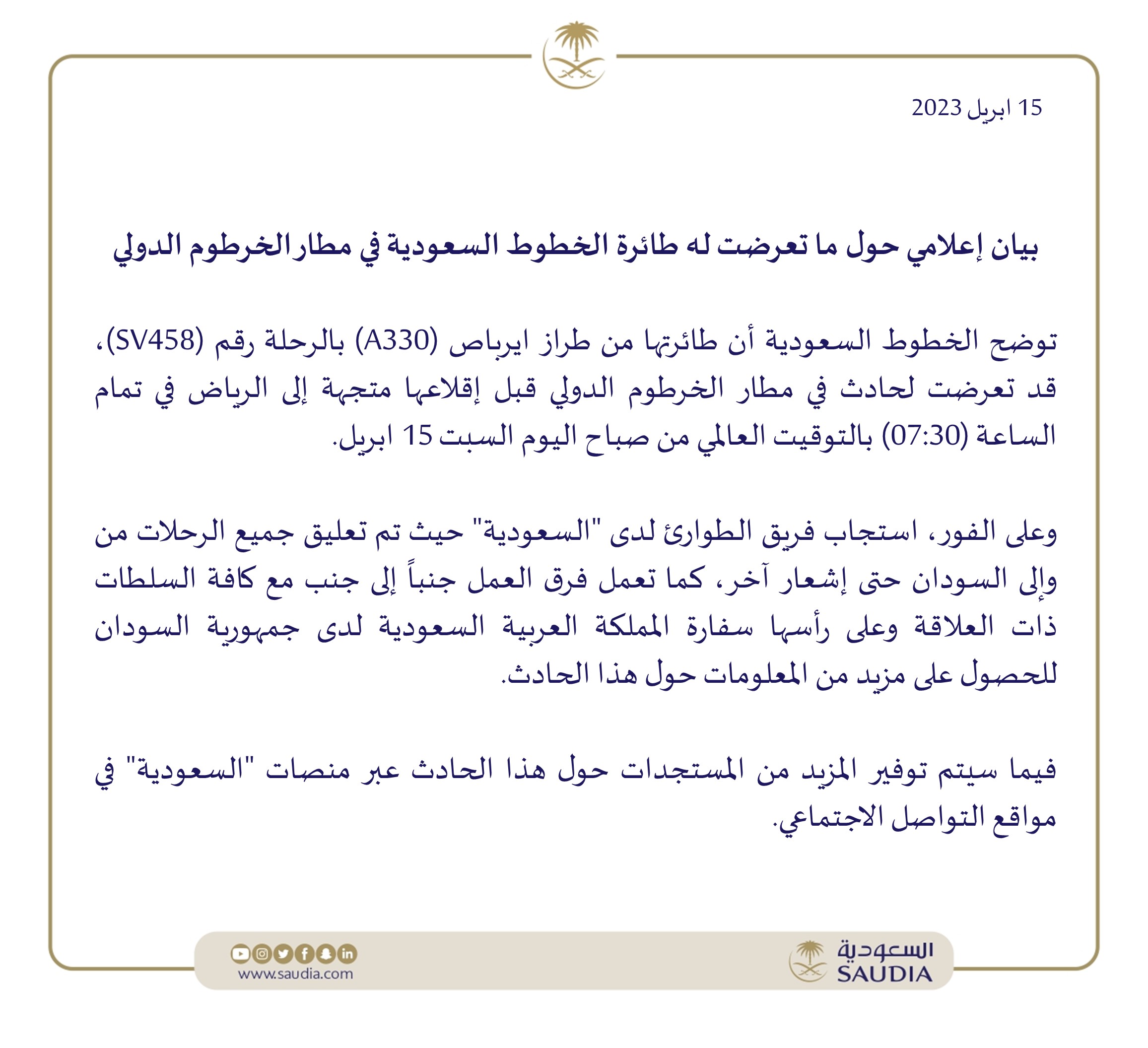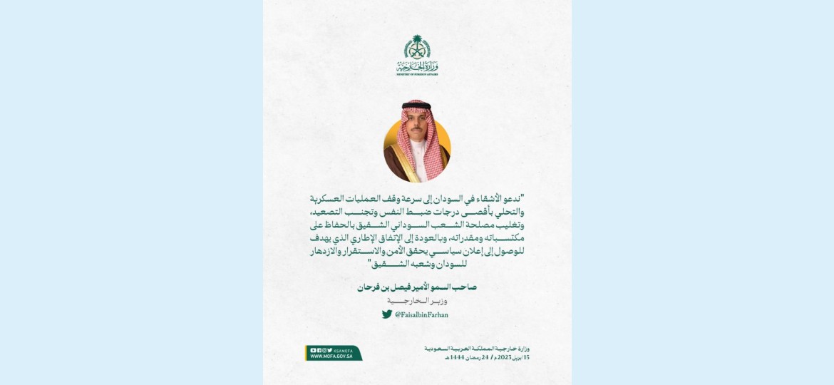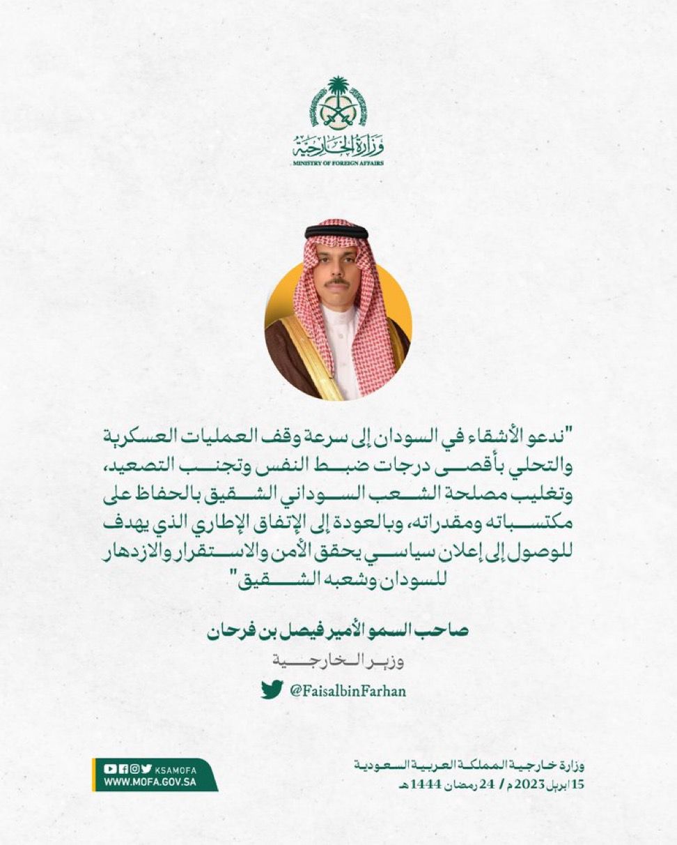 سمو وزير الخارجية الأمير #فيصلبنفرحان @FaisalbinFarhan: ندعو الأشقاء في السودان إلى سرعة وقف العمليات العسكرية والتحلي بأقصى درجات ضبط النفس وتجنب التصعيد
