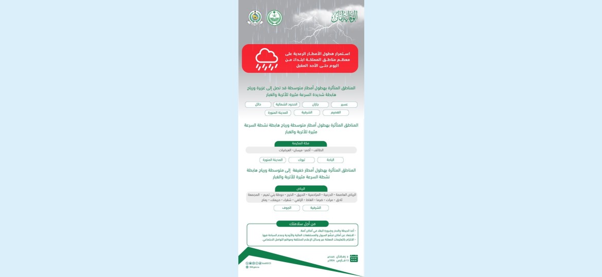 دعت المديرية العامة للدفاع المدني إلى الحيطة والحذر وضـرورة البقاء في أماكن آمنة والابتعاد عن أماكن تجمُّع السيول والمسـتنقعات المائية والأودية، وعدم السباحة فيها كونها أماكن غير مناسبة لذلك وتشكل خطورة، والالتزام بالتعليمات المعلنة عبر وسائل الإعلام المختلفة ومواقع التواصل الاجتماعي، وذلك من هطول أمطار رعدية على معظم مناطق المملكة، ابتداءً من اليوم حتى يوم الأحد المقبل.