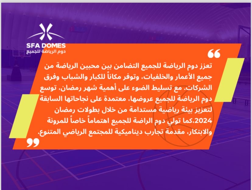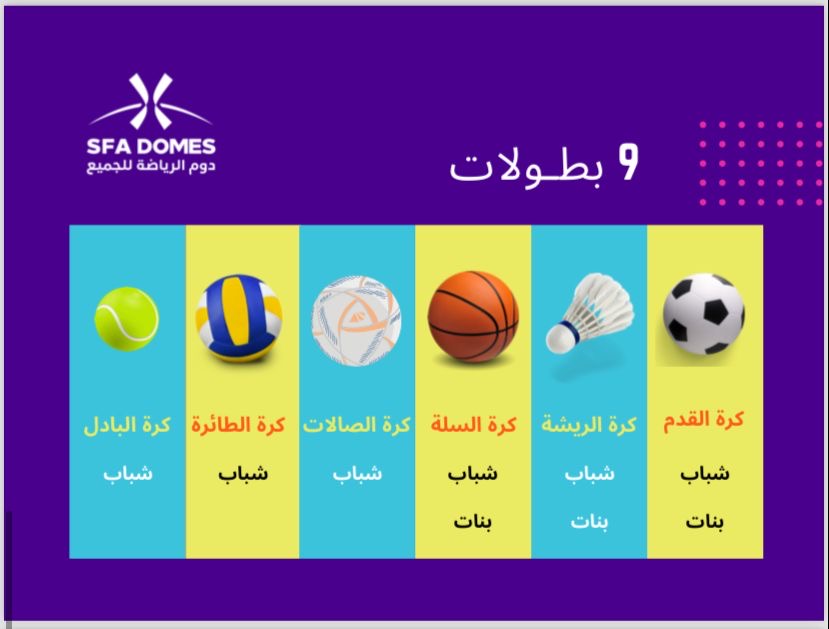 تنطلق اليوم الاربعاء ٣-٩-١٤٤٥هـ الموافق ١٣-٣-٢٠٢٤ م بطولة دوم الرياضة للجميع الرمضانية في حي بدر غرب مدينة الدمام ب9 بطولات يشارك فيها أكثر من 100 فريق في مختلف الألعاب حيث رصد دوم الرياضة للجميع جوائز مالية تتجاوز ال100 الف ريال ستوزع على أصحاب المراكز الأولى و الثانية والألعاب الفردية ، كما سيتم توزيع العديد من الجوائز القيمة للجماهير التي ستحضر لمتابعة فعاليات البطولة وهي "كرة القدم ولعبة كرة السلة و لعبة الريشة للرجال والسيدات، ولعبة البادل وكرة الصالات وكرة الطائرة للرجال" تم من خلالها تسجيل اكثر من 4000 ممارس وممارسة سيسعون خلال شهر رمضان من التنافس على المراكز الأولى لهذه الألعاب ، ويهدف الاتحاد السعودي للرياضة للجميع لتعزيز الروح الرياضية وتشجيع المشاركة الشبابية في النشاطات الرياضية ولرفع نسبة الممارسين الرياضيين من كلا الجنسين ومختلف الأعمار ما يعكس الاهتمام الكبير بالرياضة والاعتراف بأهميتها في بناء جيل صحي ومتوازن وتشجيع المواهب الشابة في تقديم افضل ما لديهم في بيئة رياضية متميزة داخل دوم الرياضة للجميع في الشرقية.