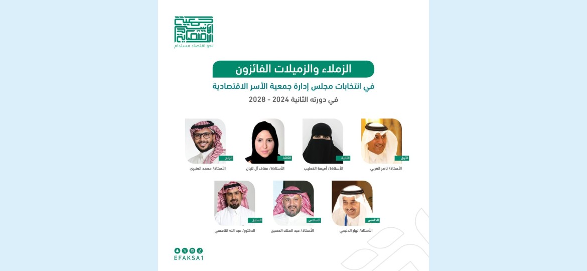 انتخبت جمعية الأسر الاقتصادية، مجلس إدارتها الجديد للدورة الثانية (2024 - 2028) وذلك في اجتماع الجمعية العمومية الأول لعام 2024 الذي تضمن العملية الانتخابية للمجلس من قبل أعضائها.