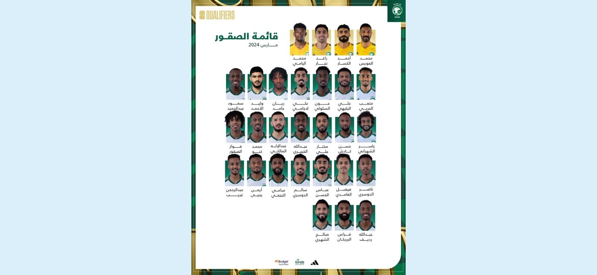 أعلن المدير الفني للمنتخب الوطني "روبرتو مانشيني" عن قائمة الأخضر استعدادًا لخوض الجولتين الثالثة والرابعة من الدور الثاني من التصفيات الآسيوية لكأس العالم 2026 وكأس آسيا 2027، ويستضيف الأخضر في الحادي والعشرين من شهر مارس الجاري منتخب طاجيكستان على استاد الأول بارك بالرياض، فيما سيحل الأخضر ضيفًا على منتخب طاجيكستان في السادس والعشرين من شهر مارس على الملعب المركزي بالعاصمة دوشنبه.وضمت قائمة مانشيني ( 28 ) لاعبًا للالتحاق بالمعسكر، وجاءت أسماؤهم على النحو التالي: محمد العويس، أحمد الكسار، راغد نجار، محمد اليامي، سعود عبدالحميد، فواز الصقور، علي البليهي، علي لاجامي، عون السلولي، حسن كادش، وليد الأحمد، ريان حامد، ياسر الشهراني، متعب الحربي، أيمن يحيى، عبدالله الخيبري، مختار علي، عبدالإله المالكي، محمد كنو، فيصل الغامدي، ناصر الدوسري، عباس الحسن، سامي النجعي، سالم الدوسري، عبدالرحمن غريب، عبدالله رديف، فراس البريكان، صالح الشهري.