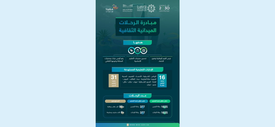 وأضاف د. الحربي أن وزارة التعليم تعمل على تنفيذ خطة تغطي جميع الإدارات التعليمية بالرحلات الداخلية والخارجية (بنين وبنات) متضمنةً اليوم والتاريخ ووجهة الرحلة وفق النماذج المخصصة لذلك، إضافة إلى ما خصصته المبادرة من أدلة تنظيمية تشمل برنامج الرحلات الثقافي والاجتماعي والعلمي والفني والتاريخي والترفيهي حسب ما يناسب كل فئة عمرية وذلك بمشاركة طلبة من الإدارة التعليمية كمرشدين سياحيين للطلبة الزائرين.