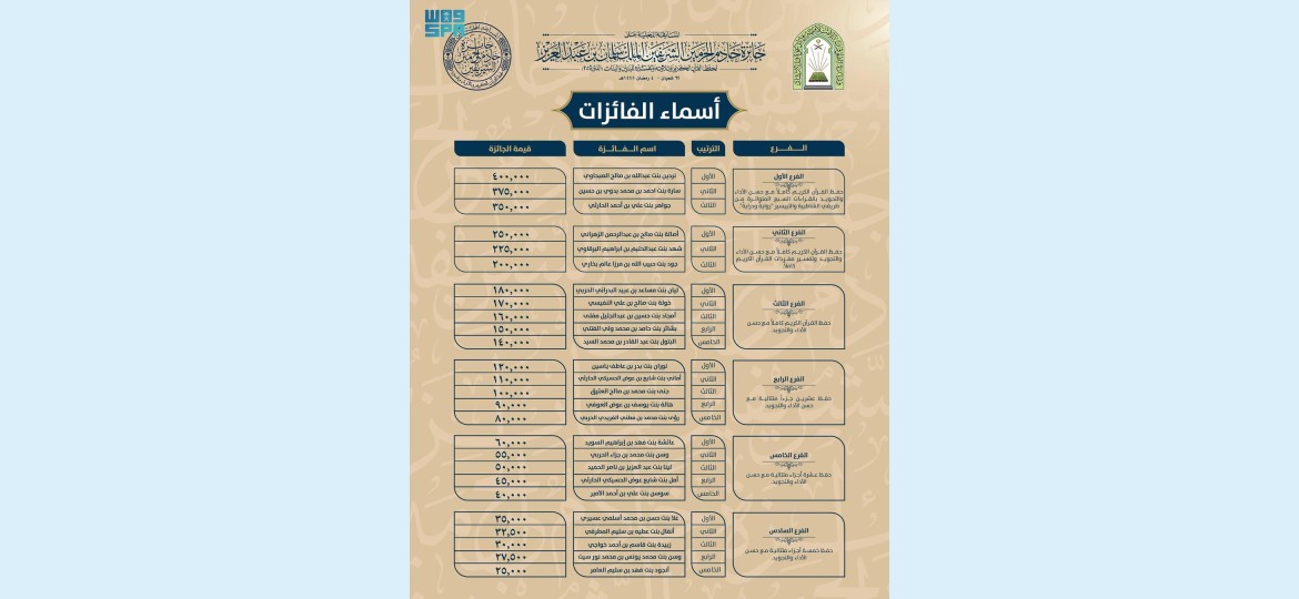 اعتمد معالي وزير الشؤون الإسلامية والدعوة والإرشاد الشيخ الدكتور عبداللطيف بن عبدالعزيز آل الشيخ، نتائج وأسماء الفائزات في المسابقة المحلية على جائزة خادم الحرمين الشريفين الملك سلمان بن عبدالعزيز آل سعود لحفظ القرآن الكريم وتلاوته وتفسيره للبنين والبنات في دورتها الخامسة والعشرين، التي عُقدت تصفياتها النهائية في مدينة الرياض خلال الفترة من 24 – 29 شعبان لعام 1445هـ، بمشاركة 125 متسابقاً ومتسابقةً تنافسوا على فروع المسابقة الستة، ويبلغ إجمالي الجوائز أكثر من 7.000.000 ريال.