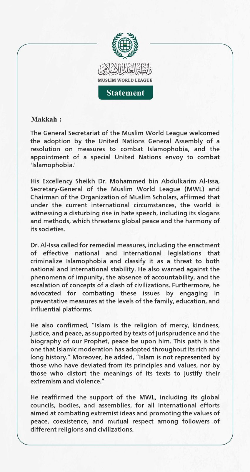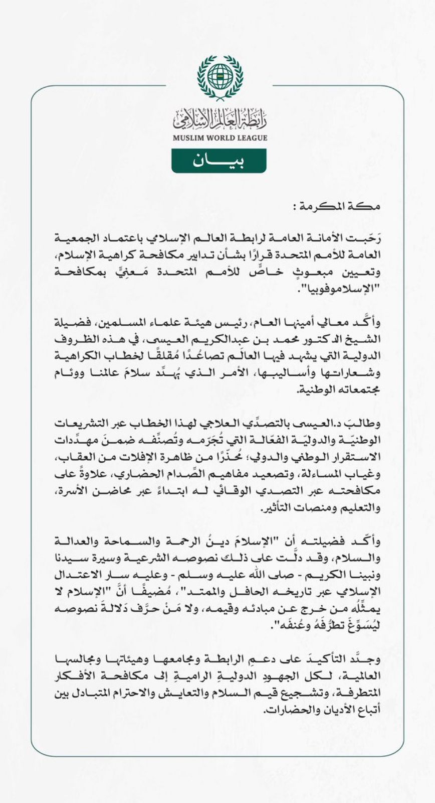 أكد الأمين العام لرابطة العالم الإسلامي رئيس هيئة علماء المسلمين الشيخ محمد العيسى أنَّ خِطابَ الكراهيّة وشعاراتها وأساليبها في تصاعُدٍ مُقلقٍ يُهدِّد سلامَ عالَمِنا ووئام مجتمعاته الوطنية، وأنَّ مكافحته تكمُن في التصدِّي الوقائي له ابتداءً عَبر محاضن "الأسرة"، و"التعليم"، و"منصّات التأثير"، وكذا التصدِّي العلاجي عَبر التشريعات الوطنيّة والدوليّة "الفعّالة" التي تُجَرِّمه وتُصنِّفه ضمن مهدداتِ الاستقرار الوطني والدولي، وتتلافى ظاهرةَ الإفلات من العقاب، وغياب المساءلة، وتصعيد مفاهيم الصدام الحضاري.