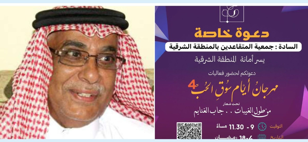 بناء على دعوة من قبل أمانة المنطقة الشرقية يعتزم أعضاء جمعية المتقاعدين بالمنطقه الشرقيه زيارة وحضور فعاليات مهرجان أيام سوق الحُب4 تحت شعار (من طول الغيبات ..جاب الغنايم )والذي بدأت فعالياته من 4رمضان و وتستمر حتى 18رمضان الموافق 14 مارس وحتى 28 مارس من الساعه 9مساءً إلى 11مساءً و ذلك بموقع سوق الحُب بالدمام.