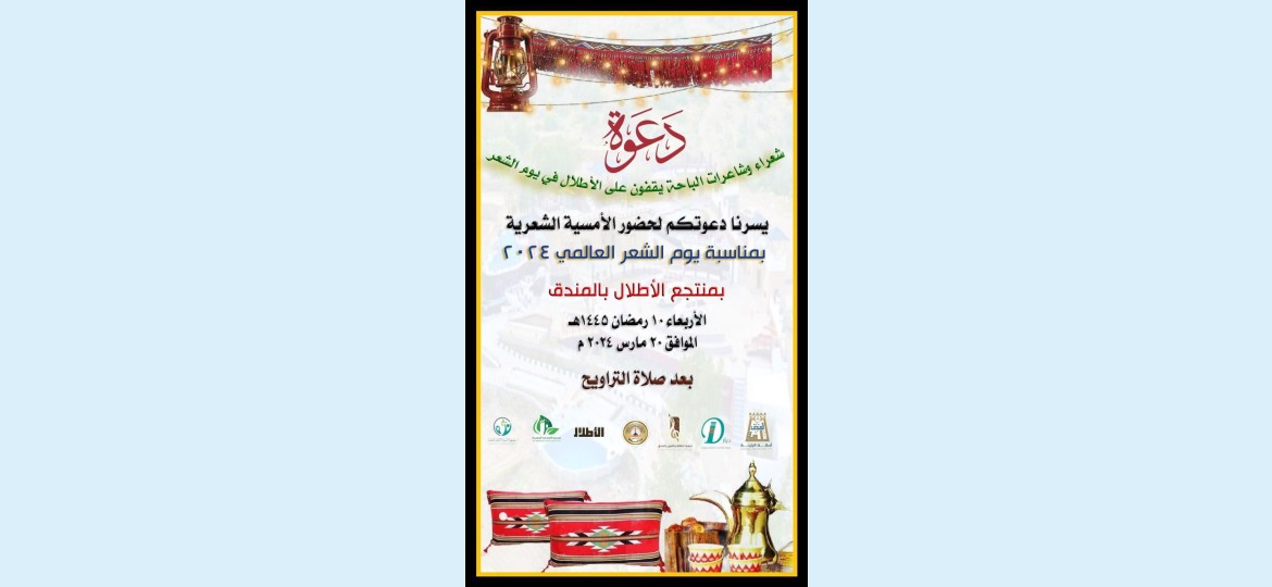 بمناسبة يوم الشعر العالمي، تقام أمسية شعرية، تحت شعار "وقوفاً على الأطلال"، وذلك في منتجع الأطلال بالمندق، يوم الأربعاء ١٠ رمضان ١٤٤٥هـ، الموافق ٢٠ مارس ٢٠٢٤ م، بعد صلاة التراويح.