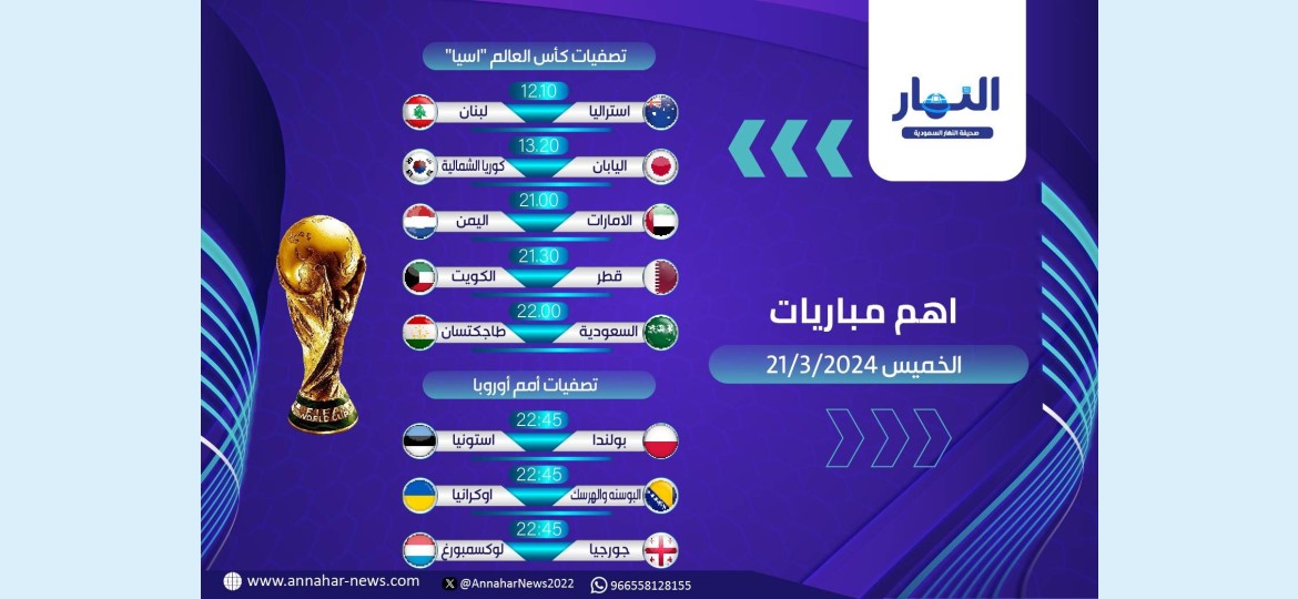 تُلعب يوم الخميس عدة مباريات ضمن تصفيات كأس العالم 2026، حيث يسعى المنتخب السعودي، لحصد النقاط الثلاث في ثالث مبارياته في تصفيات كأس العالم 2026 لقارة آسيا عندما يستضيف منتخب طاجيكستان.