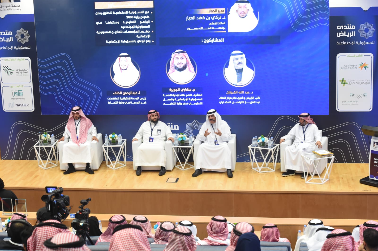 بعد ذلك بدأت جلسات المنتدى التي أدارها الدكتور تركي العيار أستاذ الإعلام بجامعة الملك سعود حيث بدأت الجلسة الأولى بعنوان (بناء ثقافة المسؤولية الاجتماعية) تحدث فيها الأستاذ الدكتور عبدالله الفوزان نائب الرئيس وأمين عام مركز الملك عبدالعزيز للتواصل الحضاري تحدث فيها عن (مفهوم وأهمية المسؤولية الاجتماعية) ثم تحدث المهندس مشاري الجويره المشرف العام على الإدارة العامة للمسؤولية الاجتماعية والعمل التطوعي في وزارة التعليم عن (البرامج التعليمية و محتواها في المسؤولية الاجتماعية وجهود وزارة التعليم في هذا المجال). واخيرا تحدث الأستاذ عبدالرحمن الخلف رئيس الوحدة الإشرافية للمنظمات غير الربحية في وزارة التجارة عن دور المسؤولية الاجتماعية في تحقيق وطن طموح.
