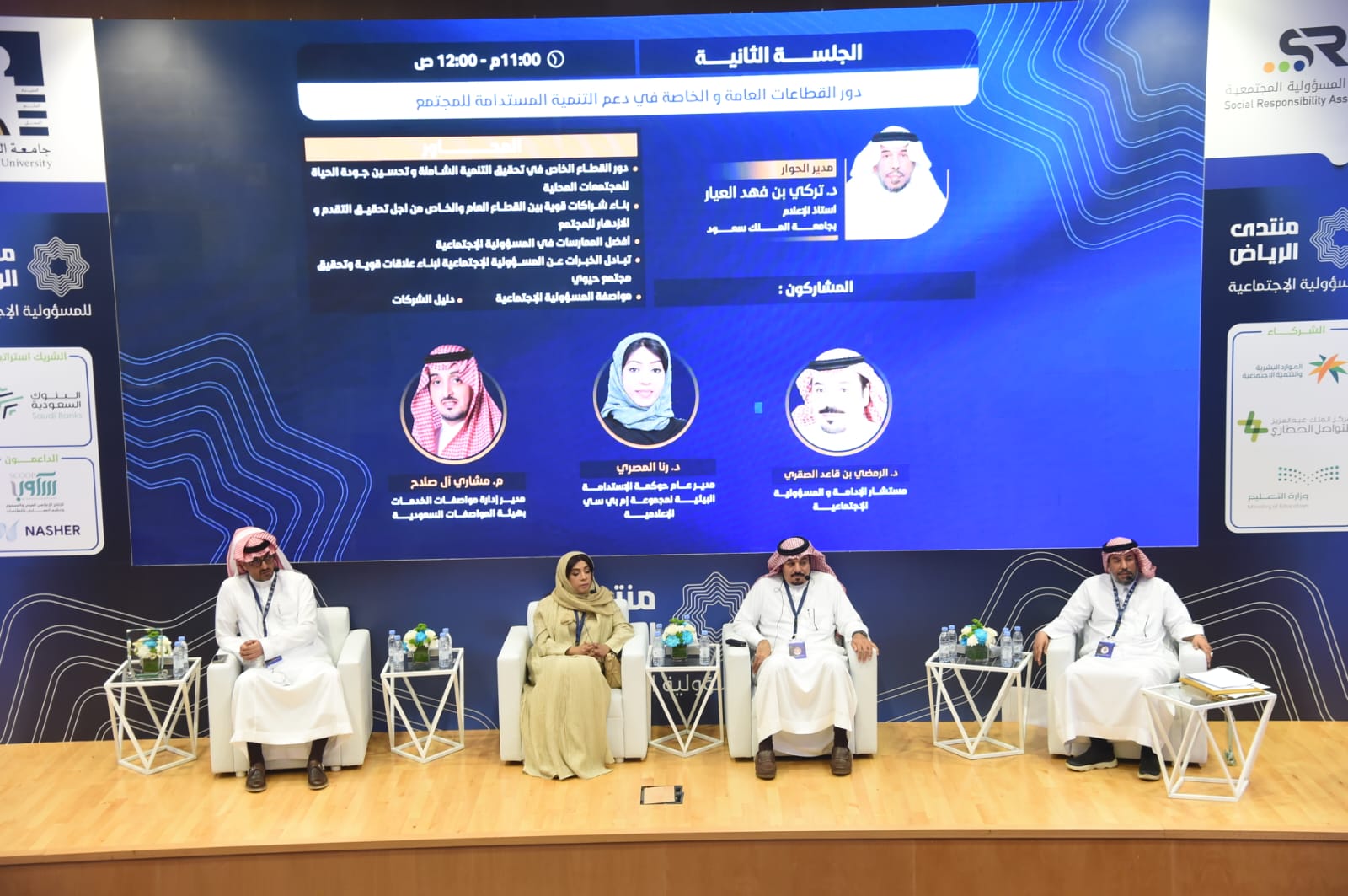 وفي الجلسة الثانية بعنوان (دور القطاعات العامة والخاصة في دعم التنمية المستدامة للمجتمع) تحدث فيها الدكتور الرمضي قاعد الصقري عن (دور القطاع الخاص في التنميه المستدامة) وتحدثت الدكتورة رنا المصري مدير حوكمة الإستدامة البيئية وإدارة تطوير رأس المال البشري لمجموعة ام بي سي الإعلامية عن ( مبادرات مجموعة ام بي سي الإعلامية في المسؤولية الاجتماعية و جهود ام بي سي الأمل في هذا المجال). واخيرا تحدث المهندس مشاري آل صلاح مدير إدارة مواصفات الخدمات بهيئة المواصفات السعودية عن (المواصفة القياسية..المسؤولية الاجتماعية-دليل الشركات)