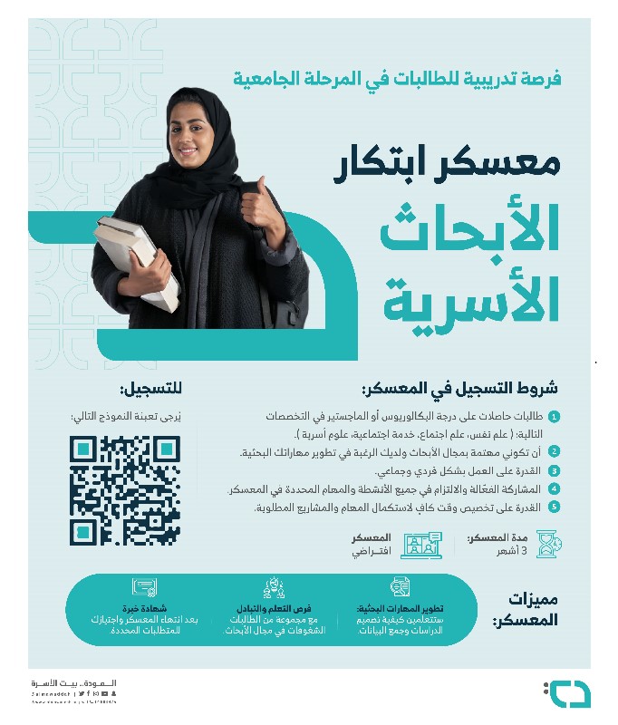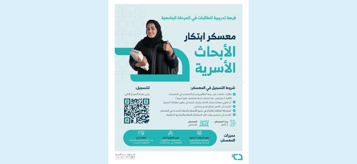أطلقت جمعية المودة للتنمية الأسرية معسكرًا لابتكار الأبحاث الأسرية لمدة ثلاثة أشهر والذي يعتبر فرصة للطالبات الطموحات للانخراط في عمل الأبحاث واكتشاف إمكانياتهن العلمية.
