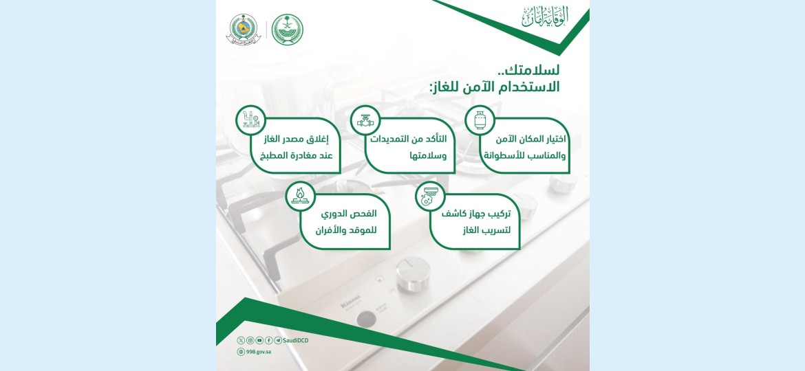 شددت المديرية العامة للدفاع المدني على أهمية اتباع الطرق الآمنة لاستخدام أسطوانات الغاز، واختيار المكان الآمن والمناسب والفحص الدوري لها، والتأكد من التمديدات وسلامتها وإغلاق مصدر الغاز عند مغادرة المكان، وتركيب جهاز كاشف لتسرب الغاز.