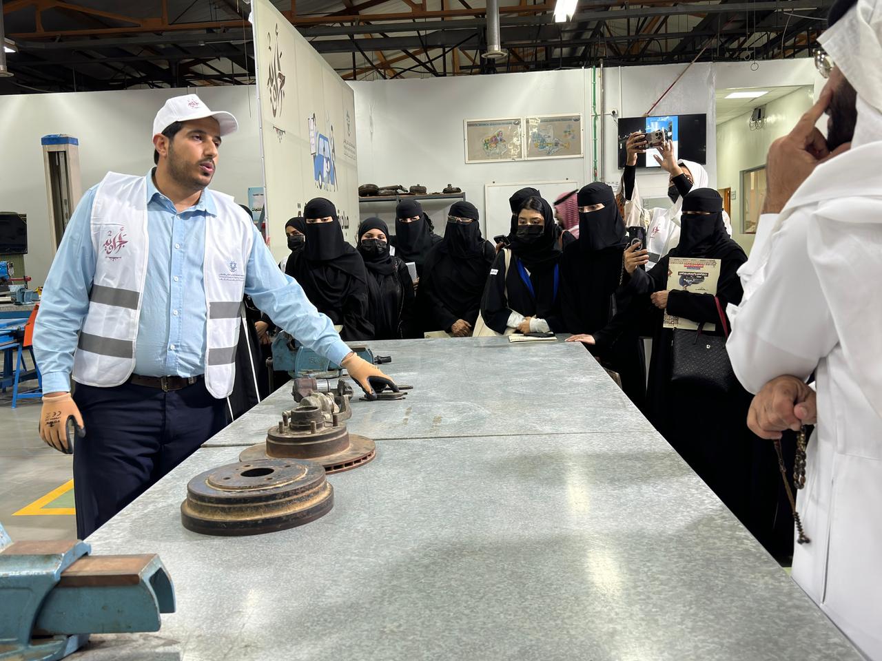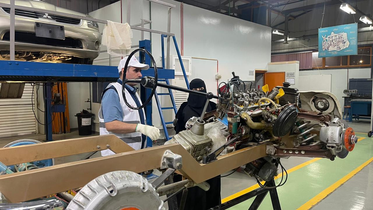 وتجول الجميع في ورشة السيارات واستمعوا الى شرحا من مهندسي القسم عن ما يقدم للسيدات من تدريب عملي في مجال كهرباء السيارات والاعطال والفرامل والمحرك الميكانيكي وصيانة البطاريات وشهدت المبادرة تفاعلا من الجميع