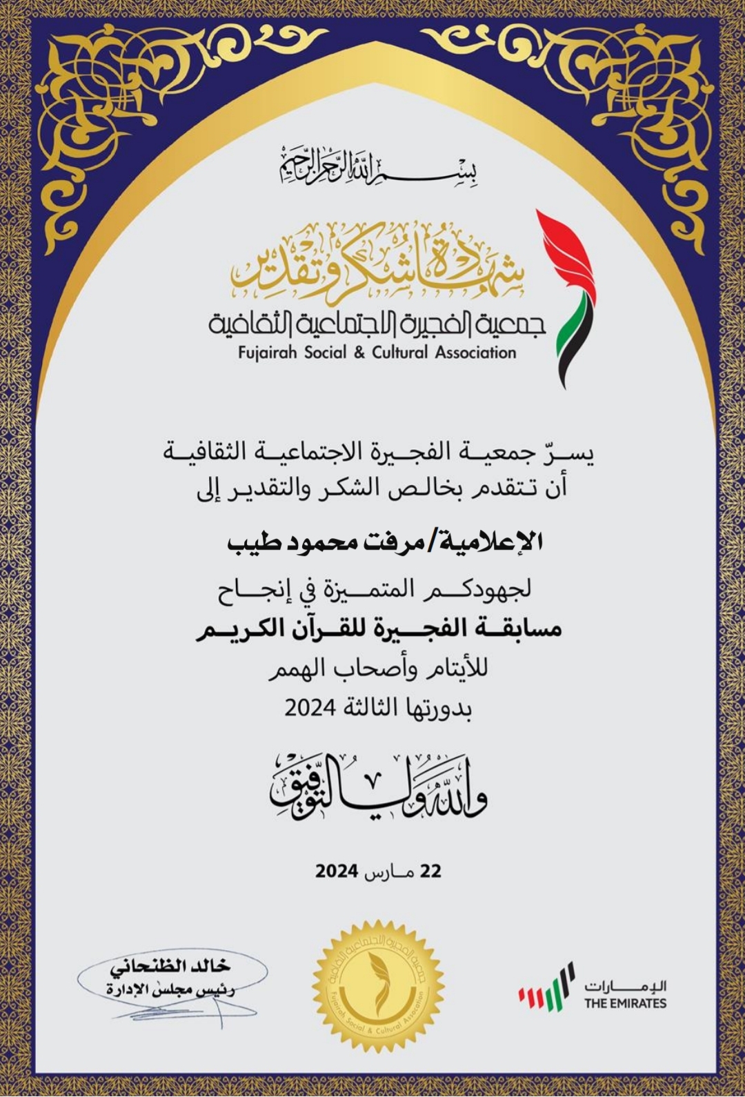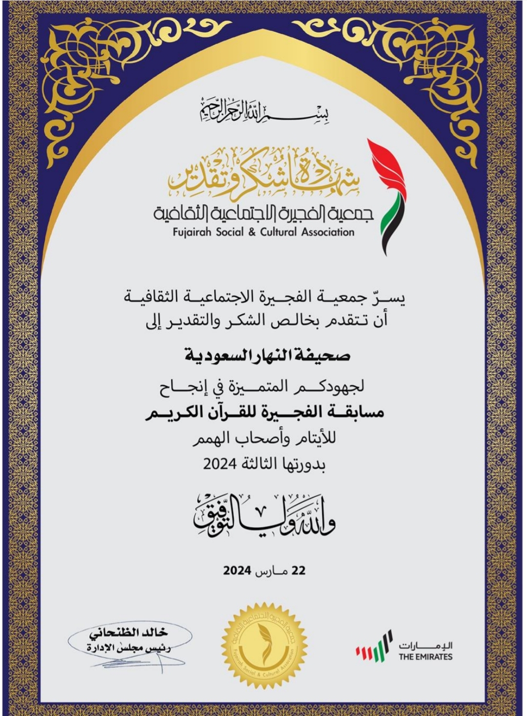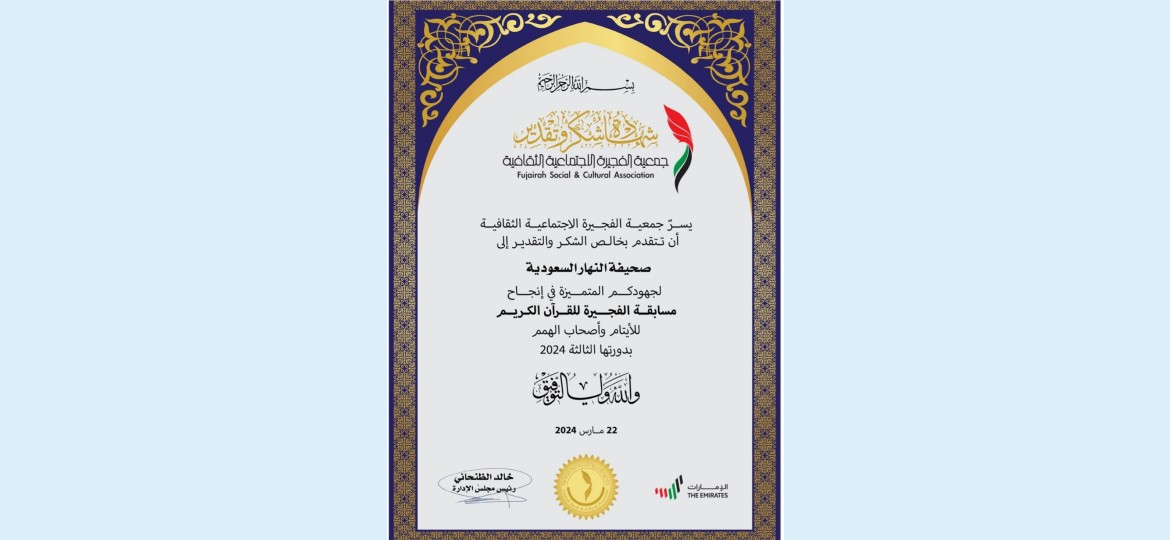 تقدمت جمعية الفجيرة الاجتماعية الثقافية بالشكر لصحيفة النهار السعودية، على جهودها لإنجاح مسابقة القرآن الكريم للأيتام وأصحاب الهمم بدورتها الثالثة ٢٠٢٤.