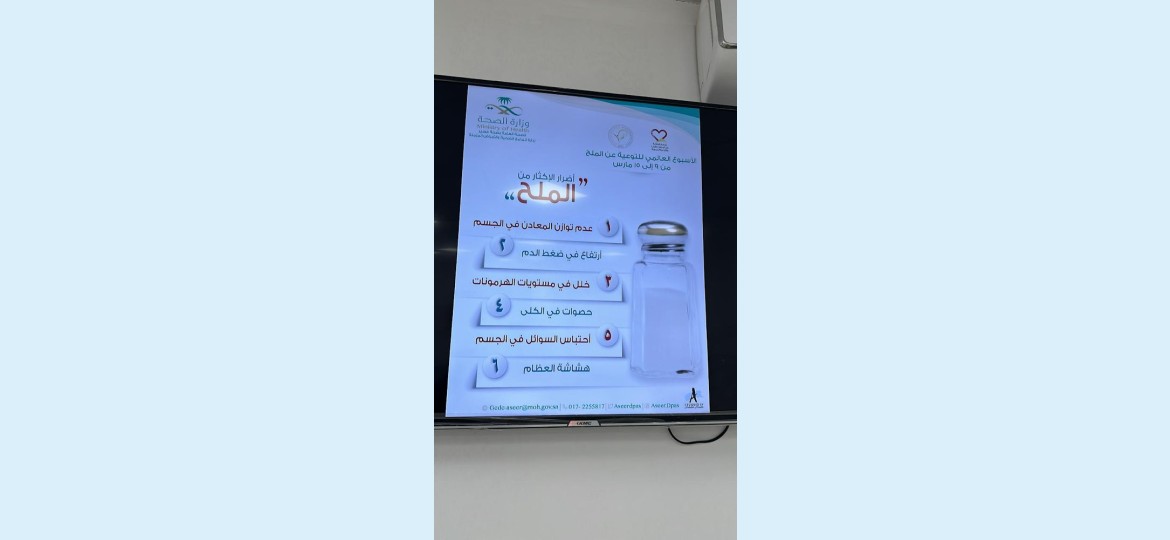 فعّل القطاع الصحي بخميس مشيط عدداً من الفعاليات، شملت التوعية بدوائك في رمضان” و ”اليوم العالمي للملح” و “قيادة بدون توقف” و “اليوم العالمي للسمنة”، وذلك من خلال تفعيل الشاشات الإلكترونية في صالات الانتظار بالمراكز الصحية التابعة للقطاع، وقد استفاد من الفعاليات أكثر من ١٨٠٠ مستفيداً.