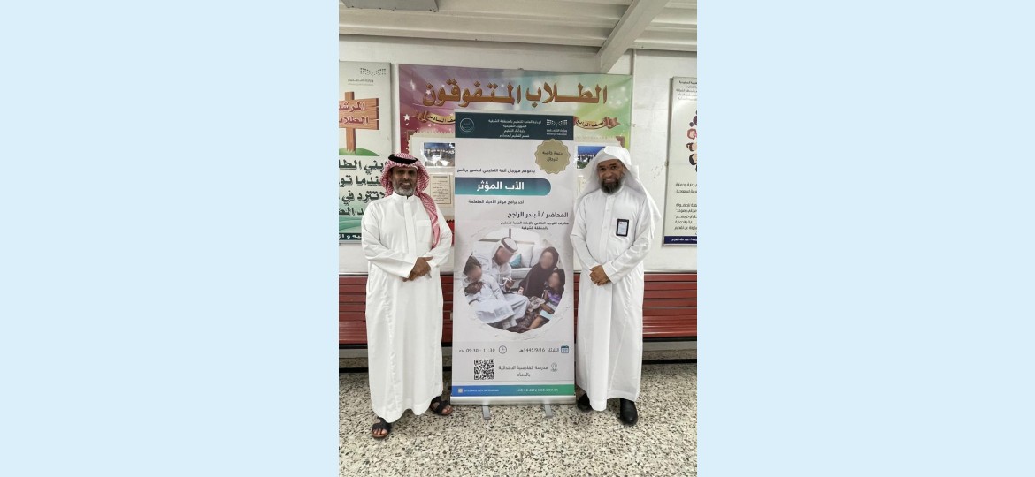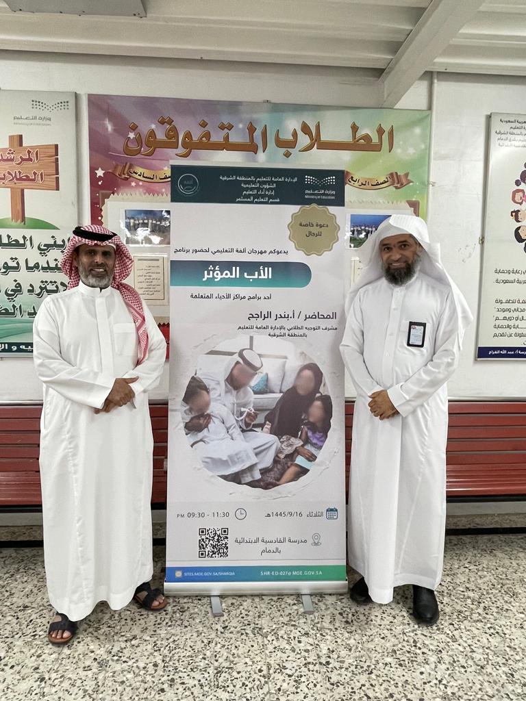 نظمت الإدارة العامة للتعليم بالمنطقة الشرقية ممثلة في إدارة أداء التعليم (قسم التعليم المستمر) ، مساء أمس الثلاثاء برنامجاً بعنوان " الأب المؤثر " استهدفت عدداً من أولياء الأمور بحي الدواسر بمقر مدرسة القادسية الابتدائية بالدمام، بحضور مشرف التعليم المستمر مفرح الشهري، ومدير المدرسة عبدالله الفراج.