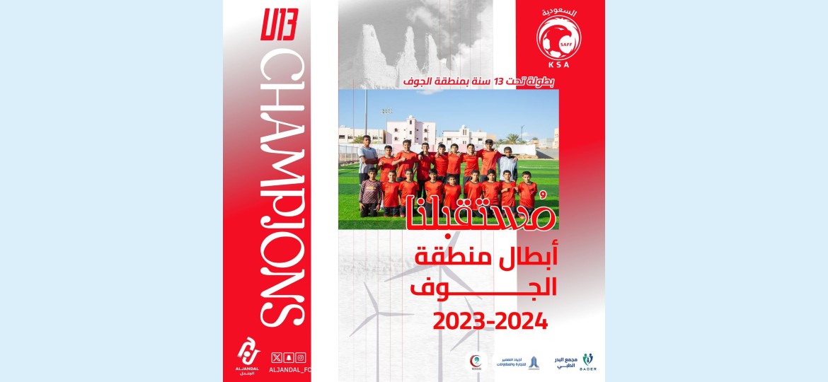 توج نادي الجندل بدوري منطقة الجوف لكرة القدم للبراعم تحت 13 سنة، وذلك بعد فوزه أمس على نادي العروبة في المباراة النهائية التي أقيمت على ملعب نادي العروبة بثلاثة أهداف مقابل هدف واحد.