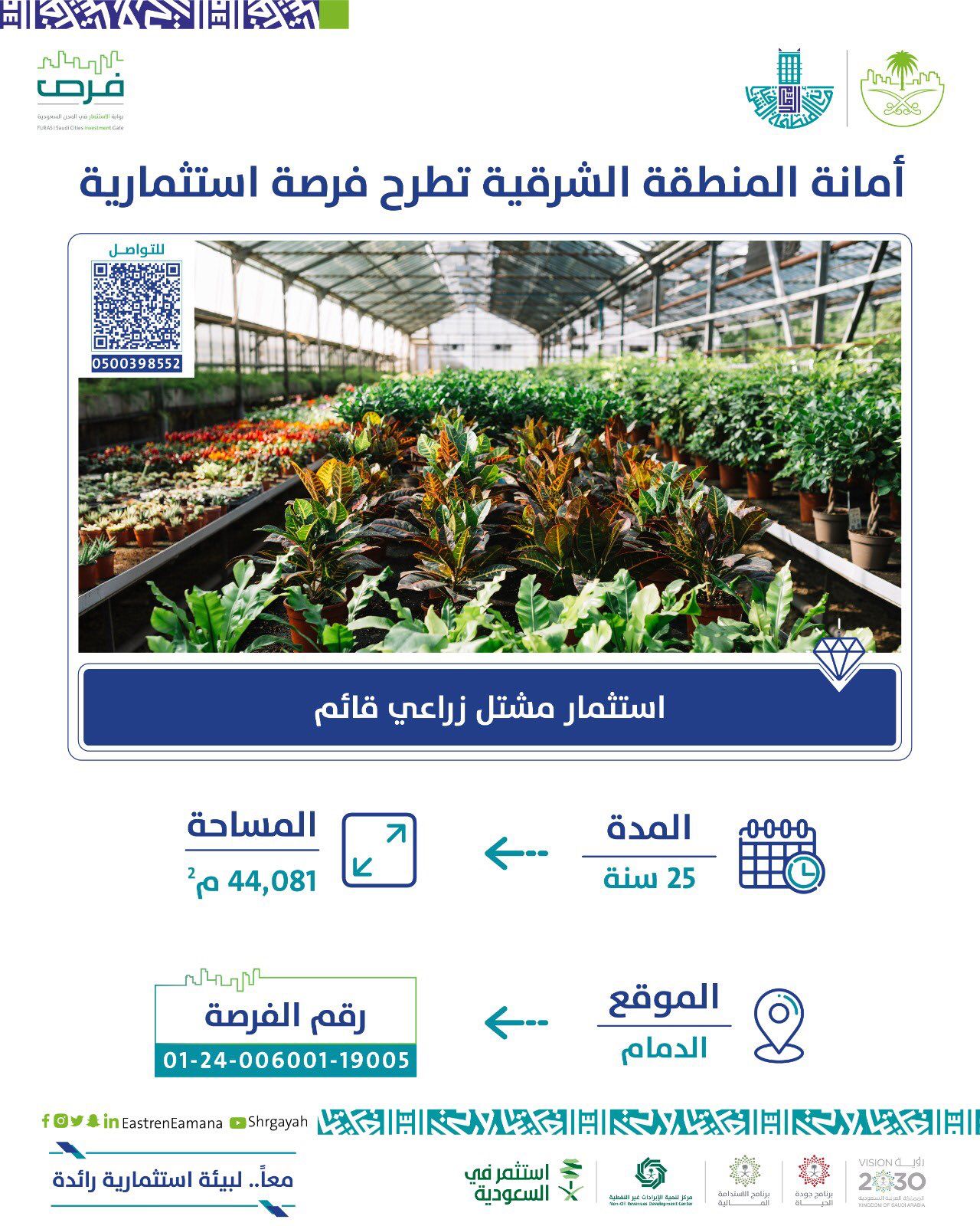 طرحت أمانة المنطقة الشرقية، فرص استثمارية لتطوير المشاتل الزراعية، على مساحة بلغت أكثر من 170 ألف متر مربع، مما يدعم جهودها، تماشياً مع مبادرة "السعودية الخضراء" لتوسيع المسطحات الخضراء ورفع نصيب الفرد بما يواكب مستهدفات وزارة الشؤون البلدية والقروية والإسكان.