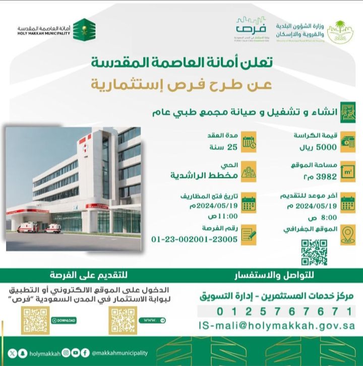 طرحت أمانة العاصمة المقدسة عدد من الفرص الاستثمارية في مواقع متفرقة بمكة المكرمة وعبر نماذج متنوعة ، وذلك ضمن جهود الأمانة لإشراك القطاع الخاص في عملية التنمية التي تتطلب عروض فنية وخبرات تأهيلية لضمان جودتها ونوعيتها وقدرة المستثمرين على الإنجاز.