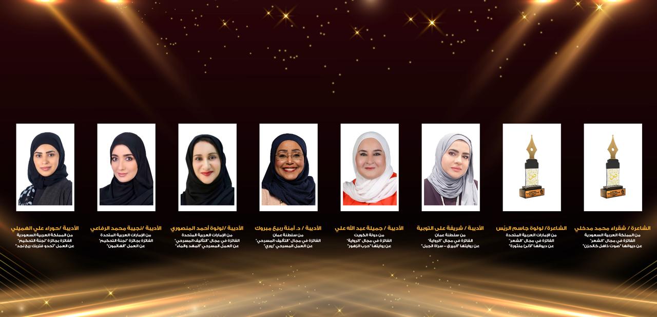 وفازت في مجال الشعر شقراء محمد مدخلي من المملكة العربية السعودية عن ديوان "صوت ذاهل كالحزن"، ولولوة جاسم الريس من دولة الإمارات العربية المتحدة عن ديوان "لآلئ منثورة"، وفي مجال الرواية فازت شريفة علي التوبية من سلطنة عمان عن رواية "البيرق سراة الجبل"، وجميلة عبدالله علي من الكويت عن رواية "حرب الزهور"، وفي مجال التأليف المسرحي فازت آمنة ربيع مبروك من سلطنة عمان عن مسرحية "روري"، ولولوة أحمد المنصوري من الإمارات العربية المتحدة عن مسرحية "المهد والماء"، فيما ذهبت جائزة لجنة التحكيم إلى كل من نجيبة محمد الرفاعي من الإمارات العربية المتحدة عن نص "الهائمون"، وحوراء علي الهميلي من المملكة العربية السعودية عن نص "تحدو فتربك ريح نجد"، فيما سيتم الإعلان لاحقاً عن الفائزة بالشخصية الثقافية للجائزة.