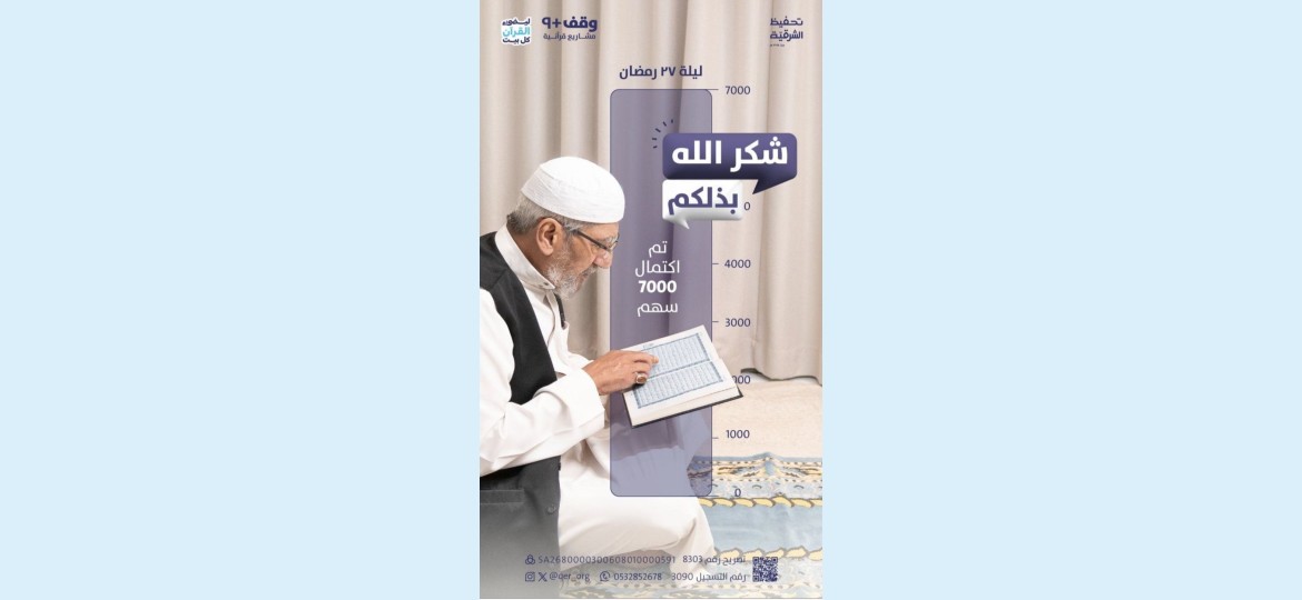 أطلقت جمعية تحفيظ الشرقية مرحلتها الأخيرة في العشر الأواخر من حملة " ليضيء القرآن كل بيت " بوقف وتسعة مشاريع قرآنية، ومازال الدعم مستمرًا في مشروع وقف وتسعة مشاريع قرآنية، وذلك بعد اكتمال أسهم ليلة 27 في مشروع تحفيظ الشرقية .