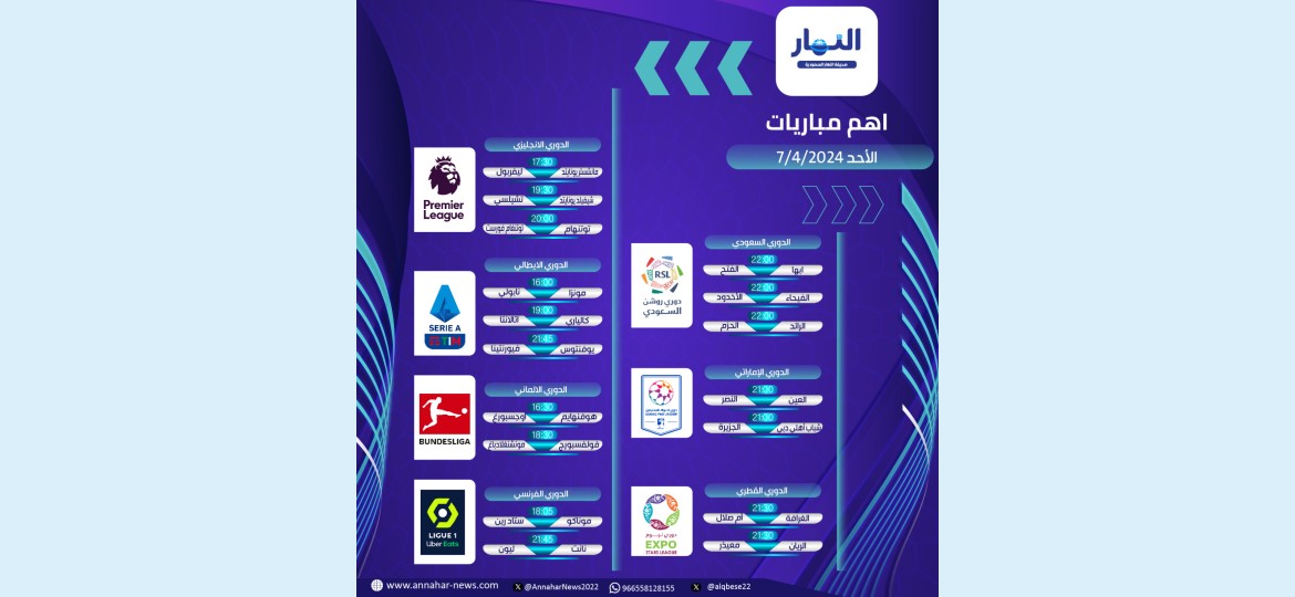 وفي الدوري الانجليزي تتجه الانظار لمباراة مانشتسر يونايتد وليفربول ؛ وفيما يلي أهم المباريات: