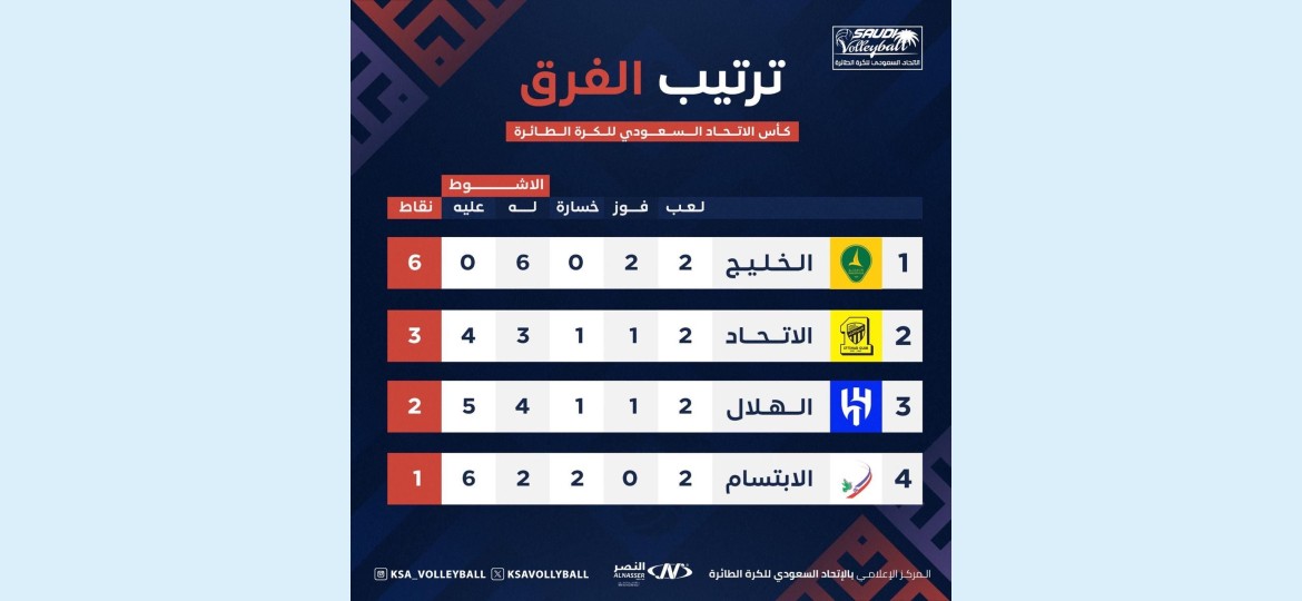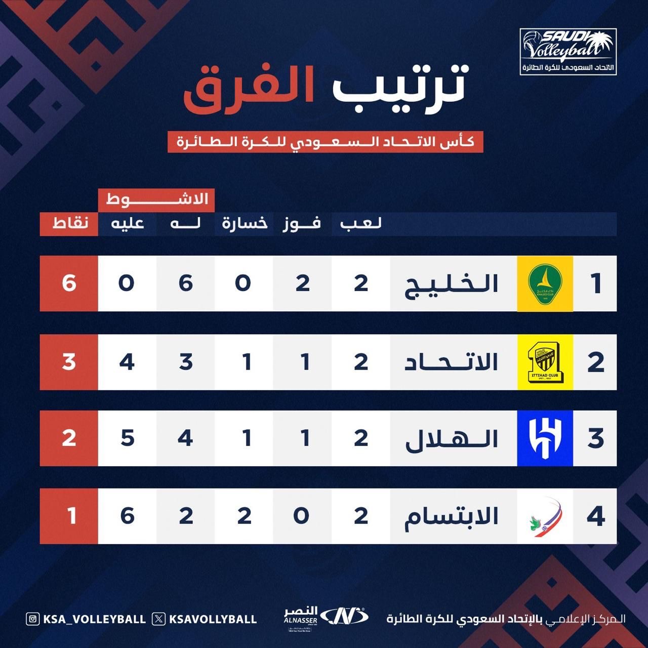 وكان الخليج حقق لقب البطولة بعد فوزه في الجولة الاولى والثانية بنتيجة ثلاثة اشواط نظيفة محققاً العلامة الكاملة بدون اي خسارة ولن تؤثر مواجهته امام الهلال على حسم اللقب في حالة خسارته باي نتيجة وياتي الاتحاد في المركز الثاني 3 نقاط ثم الهلال نقطتان والابتسام بنقطة وحيدة
