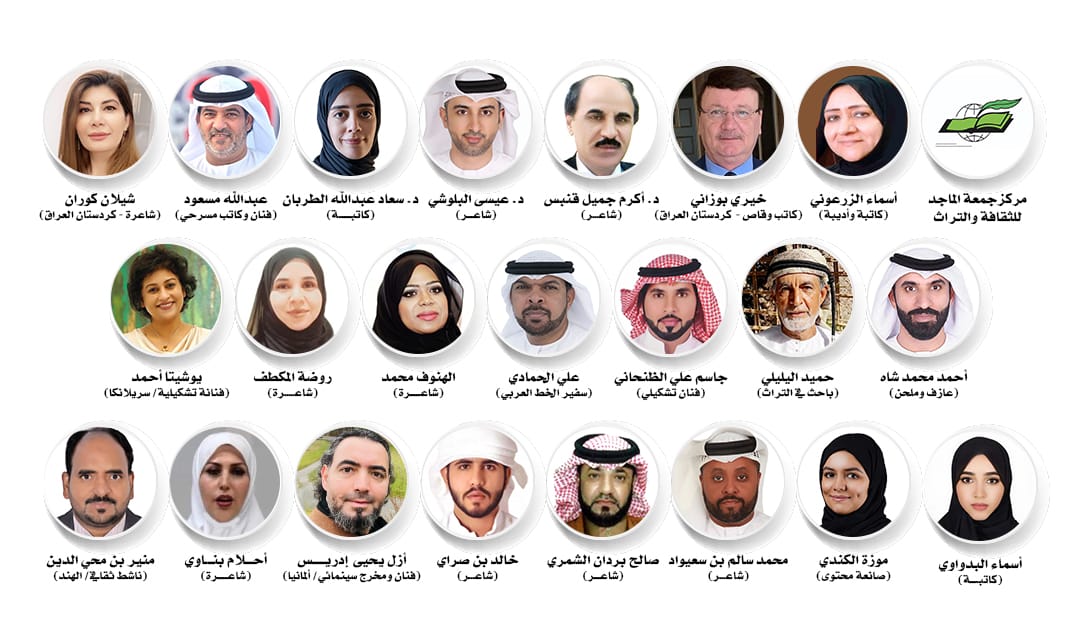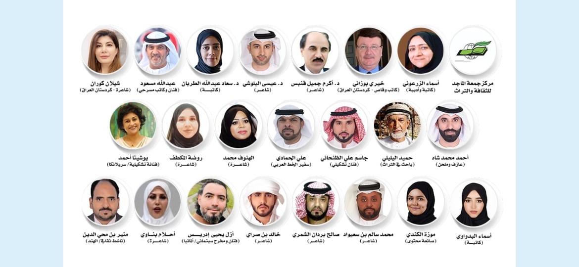 وأضافت الزيودي "سيلتقي جمهور المهرجان بأسماء أدبية وفنية مميزة، مثل، الدكتور يوسف الحسن والدكتور فالح حنظل والدكتور أحمد برقاوي وخيري بوزاني وصالحة غابش وسهام الشعشاع وشيلان كوران وجاسم الزعابي وأسماء الزرعوني والدكتور أكرم جميل قنبس والدكتور عيسى البلوشي والدكتورة سعاد الطربان وحميد اليليلي وعبدالله مسعود وجاسم علي الظنحاني وأحمد محمد شاه وعلي الحمادي والهنوف محمد وروضة المكطف ويوشيتا أحمد وأسماء البدواوي وموزة الكندي ومحمد سالم بن سعيواد وصالح بردان الشمري وخالد بن صراي وأزل إدريس وأحلام بناوي ومنير بن محي الدين".