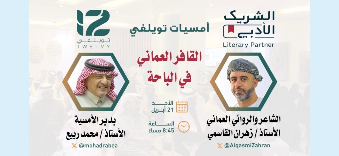 يستضيف مقهى توليفي الثقافي بالتعاون مع الشريك الأدبي، أمسية ثقافية تحت عنوان "القاف العماني في الباحة"، للشاعر الروائي العماني، زهران القاسمي، يديرها الأستاذ محمد ربيع.