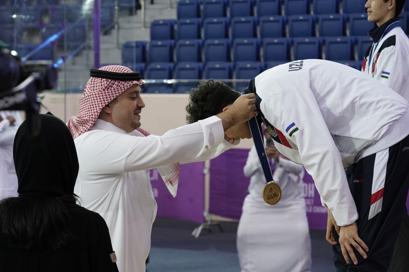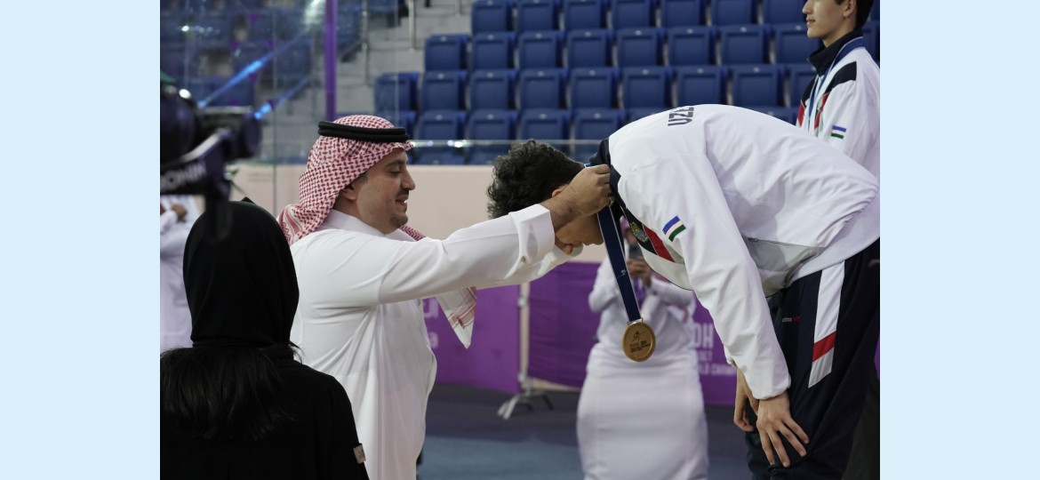 توج صاحب السمو الأمير فهد بن جلوي بن مساعد، نائب رئيس اللجنة الأولمبية والبارالمبية السعودية، الأوزبكي ساردار عبدالكريم بالميدالية الذهبية لسلاح السيبر (فردي) تحت 17 عام، في بطولة العالم للمبارزة للناشئين والشباب المقامة حاليا في صالة أرينا بجامعة الملك سعود، وذلك بحضور سالم بن سلطان القاسمي رئيس الاتحادين الاسيوي والعربي للمبارزة.