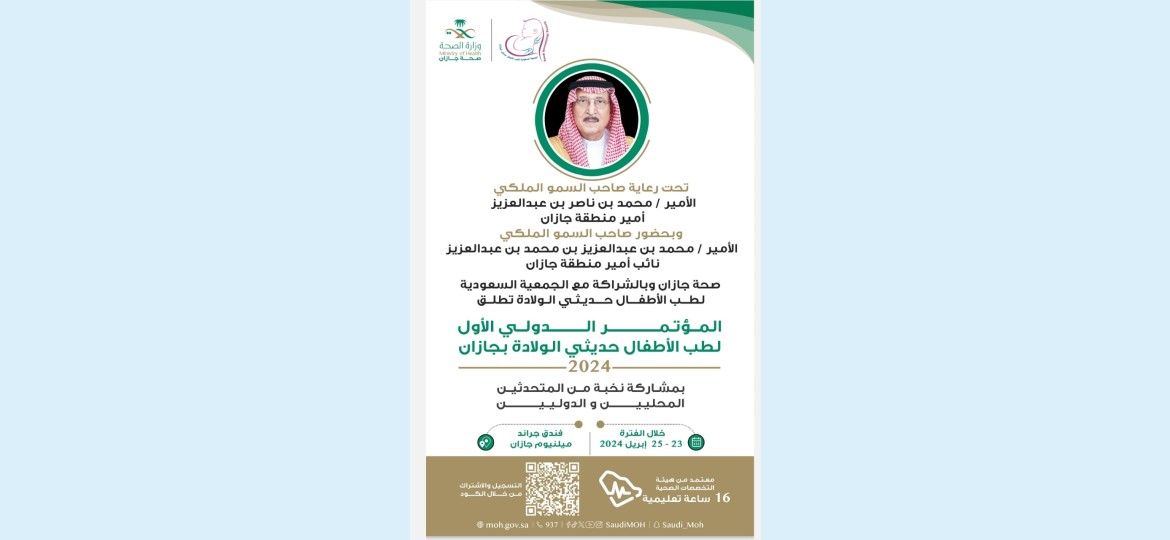 تحت رعاية صاحب السمو الملكي الأمير محمد بن ناصر بن عبدالعزيز، أمير منطقة جازان، وبحضور صاحب السمو الملكي الأمير محمد بن عبدالعزيز بن محمد، نائب أمير منطقة جازان، تطلق صحة جازان وبالشراكة مع الجمعية السعودية لطب حديثي الولادة. "المؤتمر الدولي الأول لطب الأطفال حديثي الولادة 2024 م " وذلك في 23 وحتى 25 إبريل بفندق قراند ميلينيوم بجازان.
