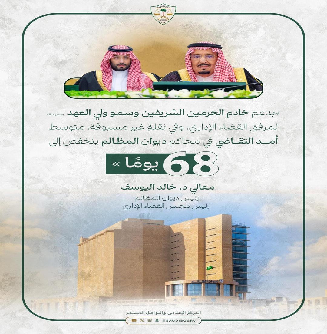 ونوه أن ديوان المظالم استفاد في مدة وجيزة مما تم في أتمتة جميع خدماته بالمنصات الرقمية؛ بما في ذلك التقاضي عبر الاتصال المرئي أمام محاكمه بمختلف مراحلها في مناطق المملكة كافة؛ ما أسهم في تجويد وإنجاز الصادر عن محاكمه وفق إستراتيجيات واضحة ومحددة في سبيل تسريع إنجاز الدعاوى ومراعاة الجهد والوقت على أطرافها، إلى أن حقق الديوان مستهدفه للعام 2025 قبل عامين، واليوم يُعلن تقليص أمد التقاضي إلى 68 يومًا بما يزيد عن 80% خلال ثمانية أعوام.