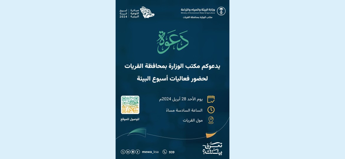 يستعد مكتب وزارة البيئة والمياه والزراعة بمحافظة القريات لإطلاق فعاليات اسبوع البيئة 2024 تحت شعار ( تعرف بيئتك ) في مول القريات يوم الأحد ١٩ شوال ١٤٤٥هـ الموافق 28 أبريل 2024 ، عند الساعة السادسة مساءً ، والذي يشمل العديد من الفعاليات ( محاضرات توعوية ، توزيع شتلات و بذور ، منشورات إرشادية ، هدايا )، بالإضافة إلى مرسم للأطفال ، ولمدة ثلاثة أيام داخل المول ، يليها إتاحة مبادرات الفرص التطوعية بحملات التشجير و نظافة الأودية ، وأكد مدير مكتب وزارة البيئة والمياه والزراعة بمحافظة القريات الأستاذ / ناجح بن سالم الشراري أن أسبوع البيئة يأتي لتعزيز الشعور بالمسؤولية تجاه بيئة الوطن، والمساهمة في رفع مستوى الوعي البيئي لدى كافة فئات المجتمع وقطاعاته المختلفة، ونشر المعرفة بأهم قضايا البيئة في المملكة، وتحفيز الالتزام البيئي، وتصحيح السلوكيات الخاطئة تجاه البيئة، وتعزيز السلوكيات الإيجابية، داعيًا مختلف مكونات المجتمع من كيانات وأفراد إلى المشاركة في فعاليات الأسبوع التي تنتظم في جميع المناطق