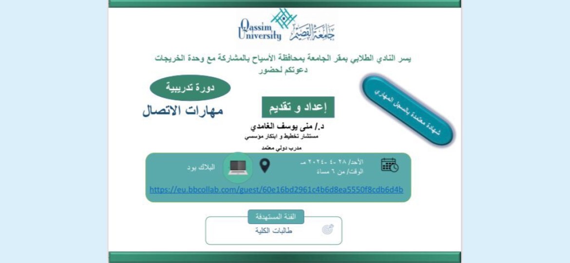 دعا النادي الطلابي بمقر جامعة القصيم بمحافظة الأسياح بالمشاركة مع وحدة الخريجات لحضور دورة تدريبية تحت عنوان "مهارات الاتصال"، من إعداد وتقديم الدكتورة منى يوسف الغامدي، مستشار تخطيط وابتكار مؤسسي، مدرب دولي معتمد، ومن المقرر أن تعقد الدورة في تمام الساعة السادسة من مساء اليوم الأحد الموافق 28 أبريل الجاري عبر تقنية البلاك بورد.