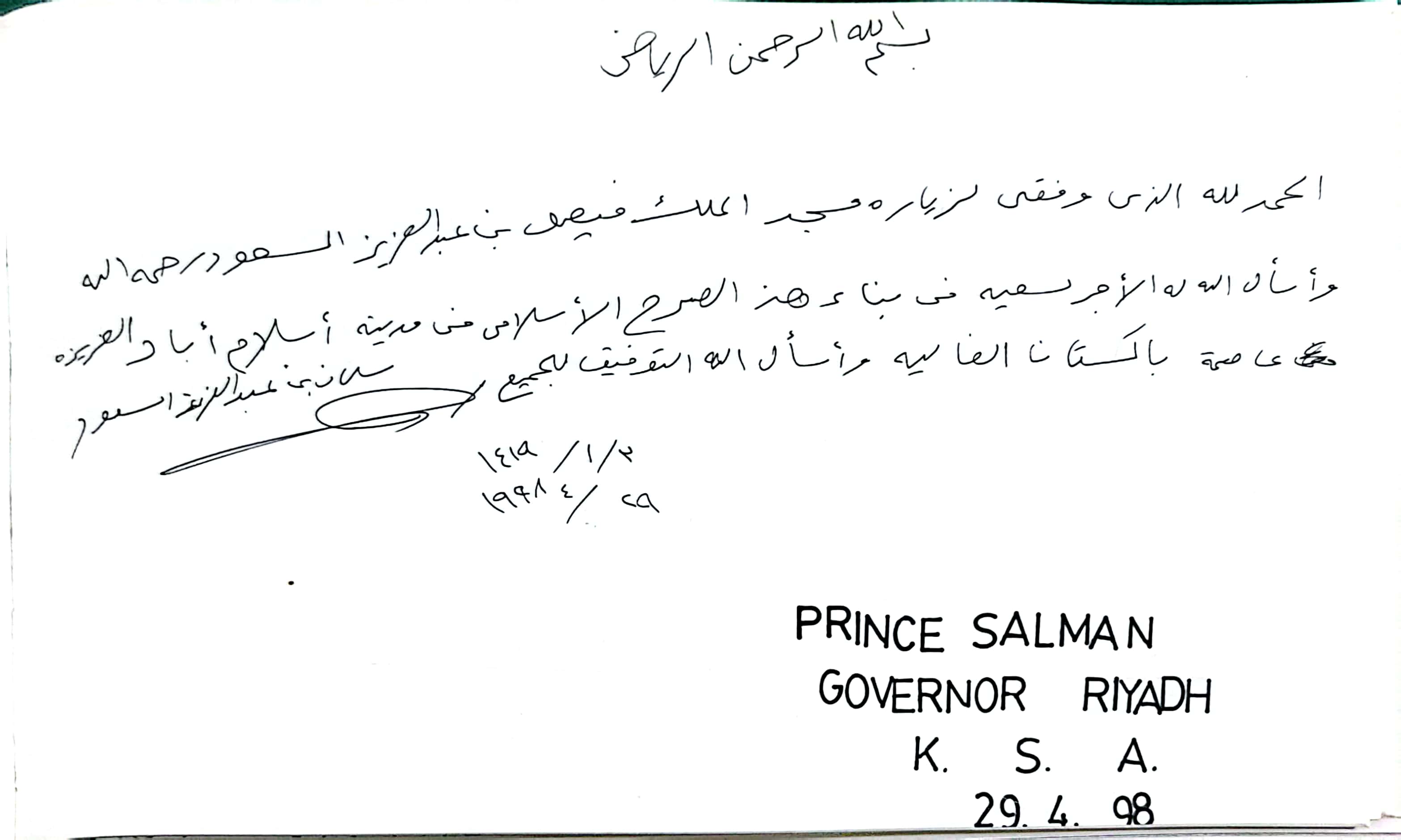 "الحمد لله الذي وفقني لزيارة مسجد الملك فيصل بن عبد العزيز آل سعود رحمه الله وأسأل الله له الأجر لسعيه في بناء هذا الصرح الإسلامي في مدينة إسلام آباد العزيزة عاصمة باكستان الغالية وأسأل الله التوفيق للجميع .. سلمان بن عبد العزيز آل سعود .. ٣ / ١ / ١٤١٩ هـ - ٢٩ / ٤ / ١٩٩٨ م".