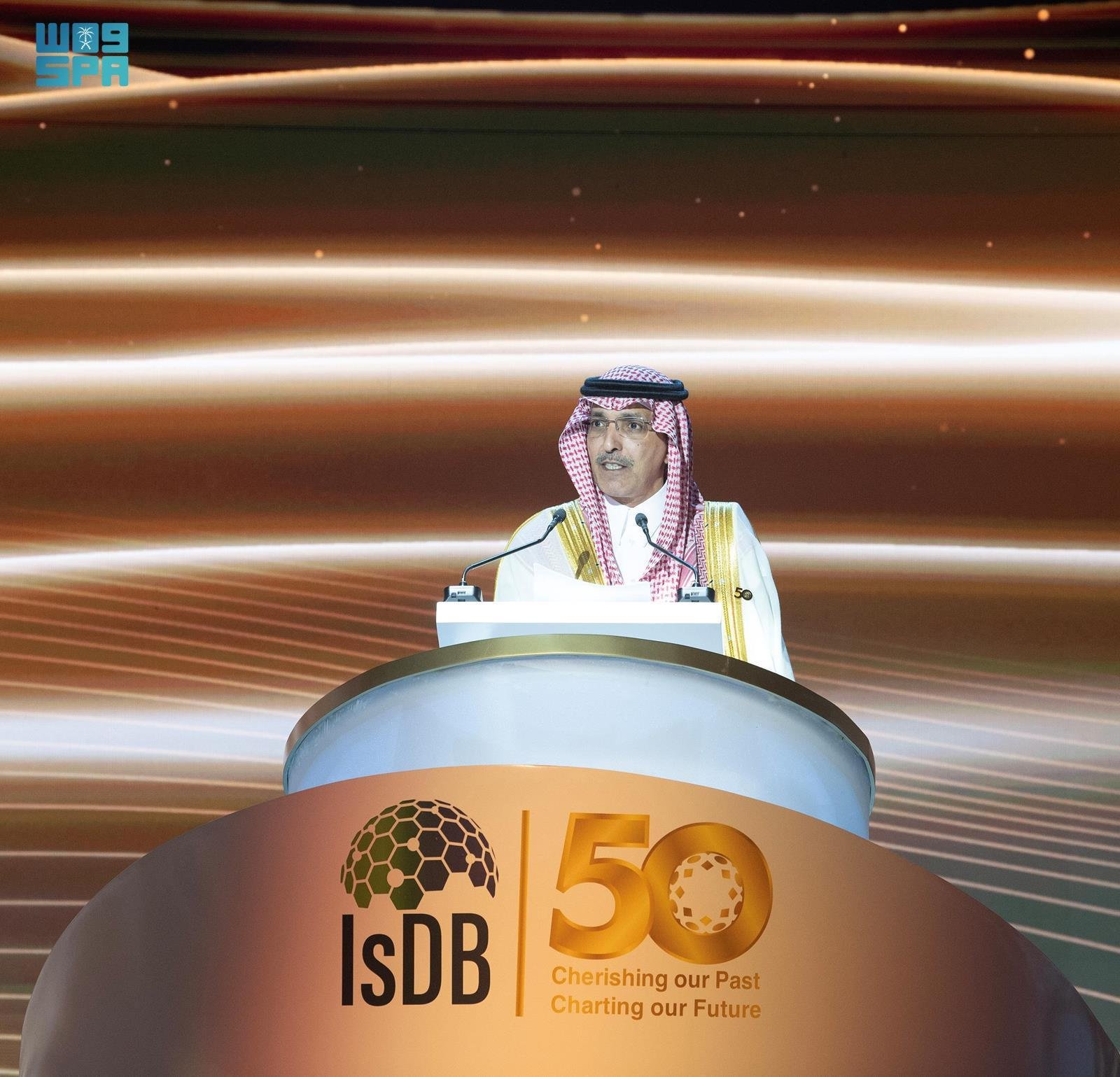 وبعد ذلك ألقى معالي وزير المالية، رئيس مجلس محافظي مجموعة البنك الإسلامي للتنمية الأستاذ محمد بن عبدالله الجدعان، كلمة حفل اليوبيل الذهبي لمجموعة البنك، وأكّد فيها أن البنك يعطي صورة عملية للتضامن بين الدول الإسلامية، وقال: "وبعد مضي نصف قرن، نقف شهوداً على ما حققه البنك من إنجازات بفضل من الله ثم نتيجة للجهود المبذولة والدعم الكبير الذي يحظى به"، مشيراً إلى استمرار المجموعة في مواكبة التغيرات والتطورات من خلال تطوير أدواتها وأسلوب عملها حتى أصبحت مجموعة متكاملة تقدم حلولاً تمويلية لكافة المجالات التي تلامس حياة الإنسان وتسهم في الحد من الفقر وتحقيق المكاسب التنموية الرائدة في العديد من القطاعات الحيوية.